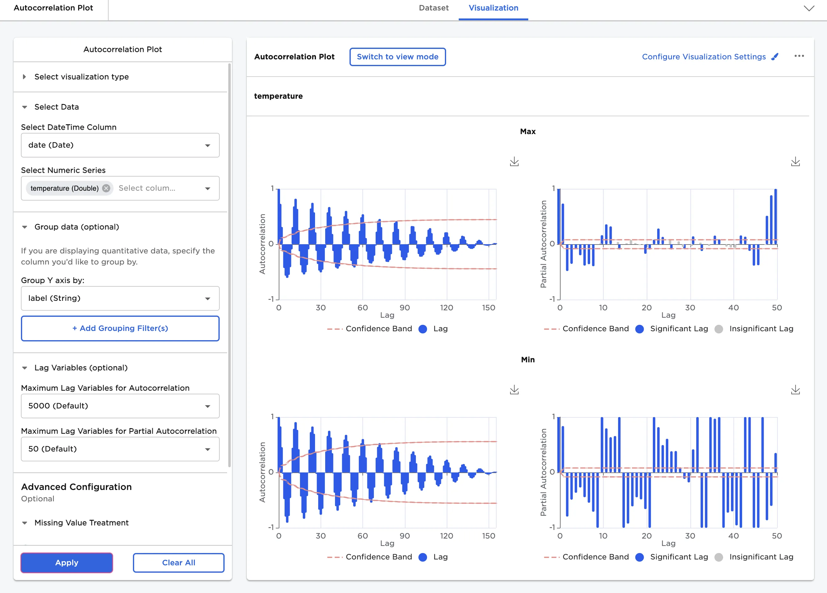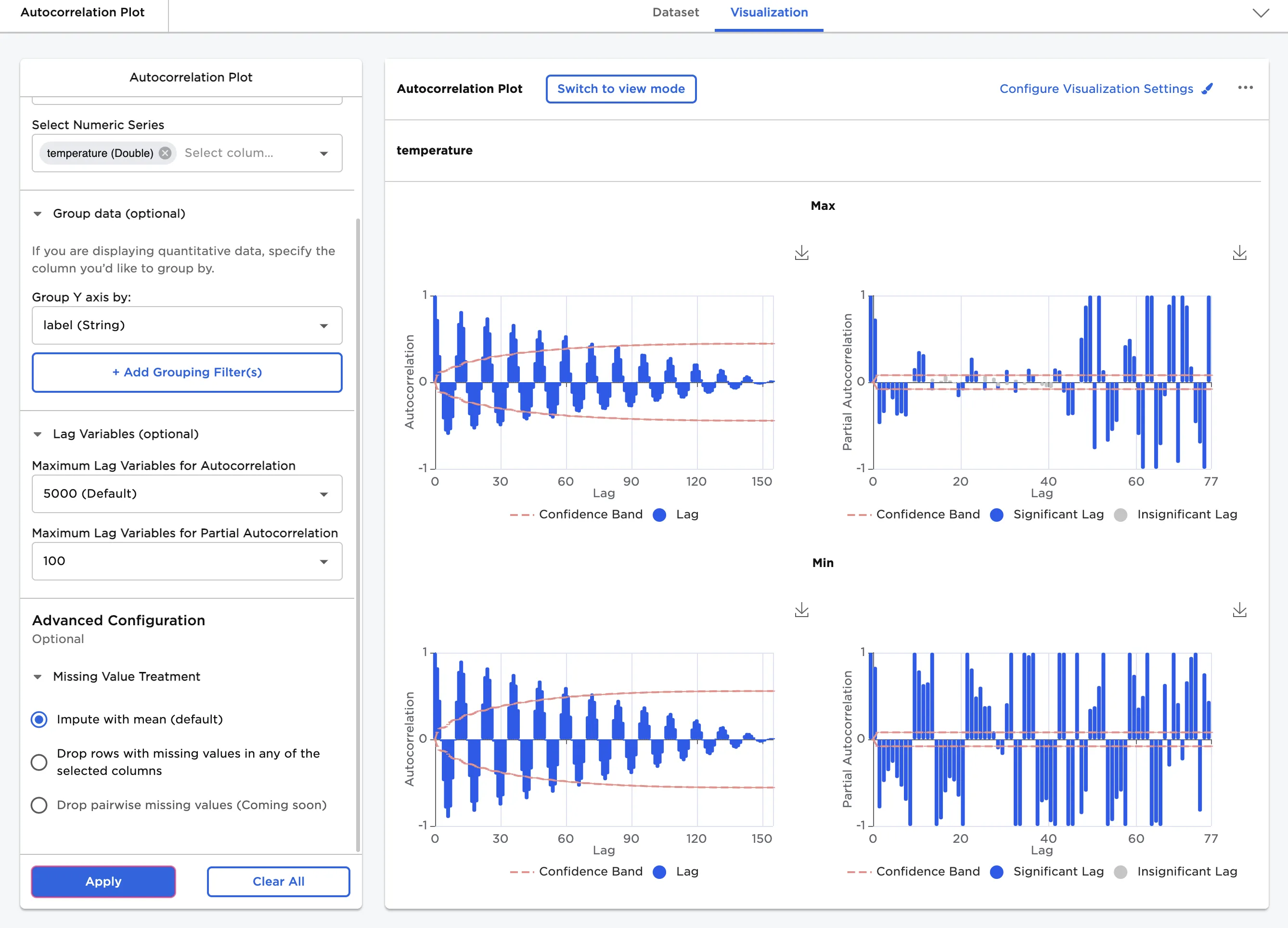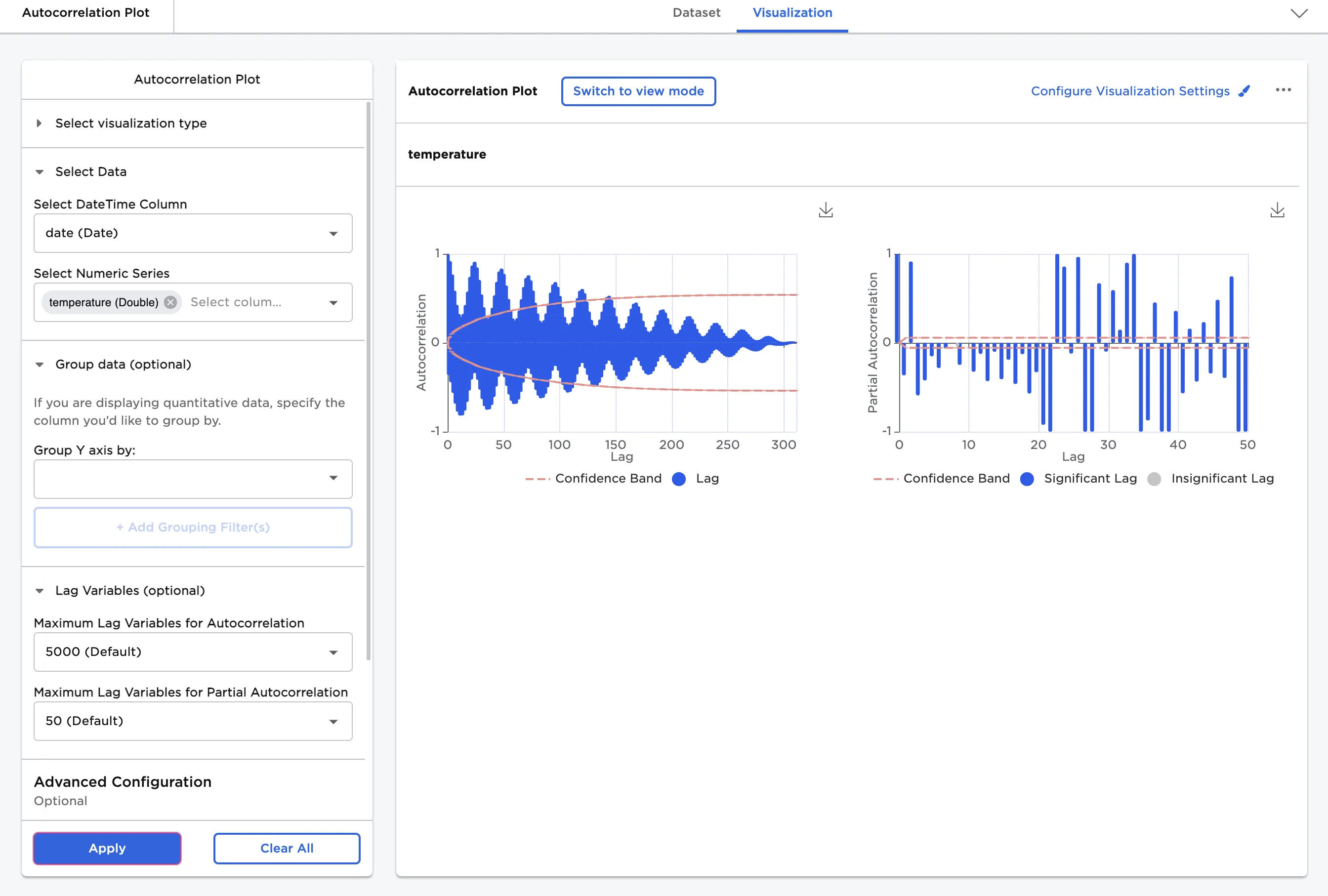 - Select Apply to create an autocorrelation plot with the default settings.