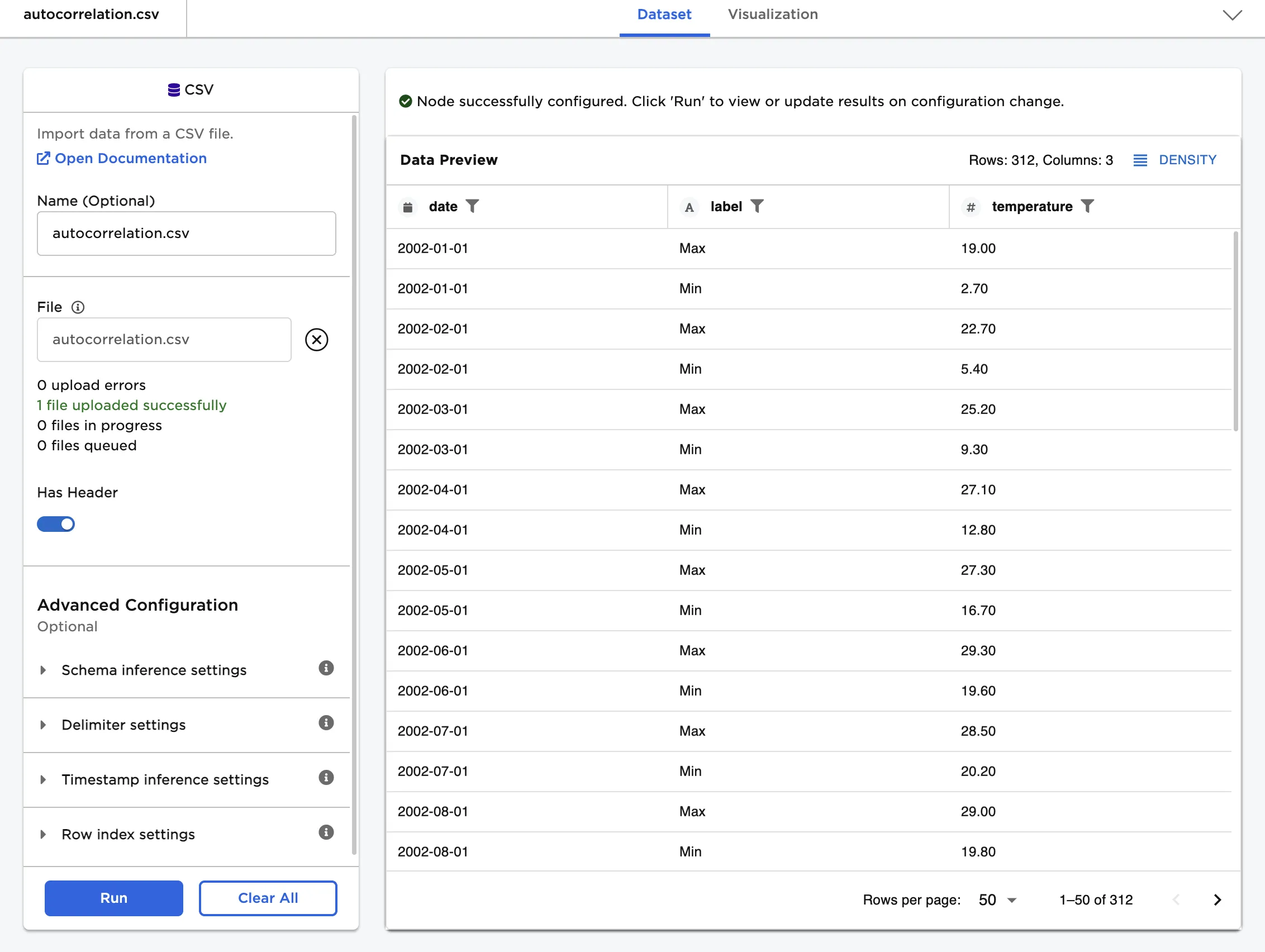 - Connect an Autocorrelation Plot node to an existing node. In this example, connect the node to a CSV node that contains the example data.