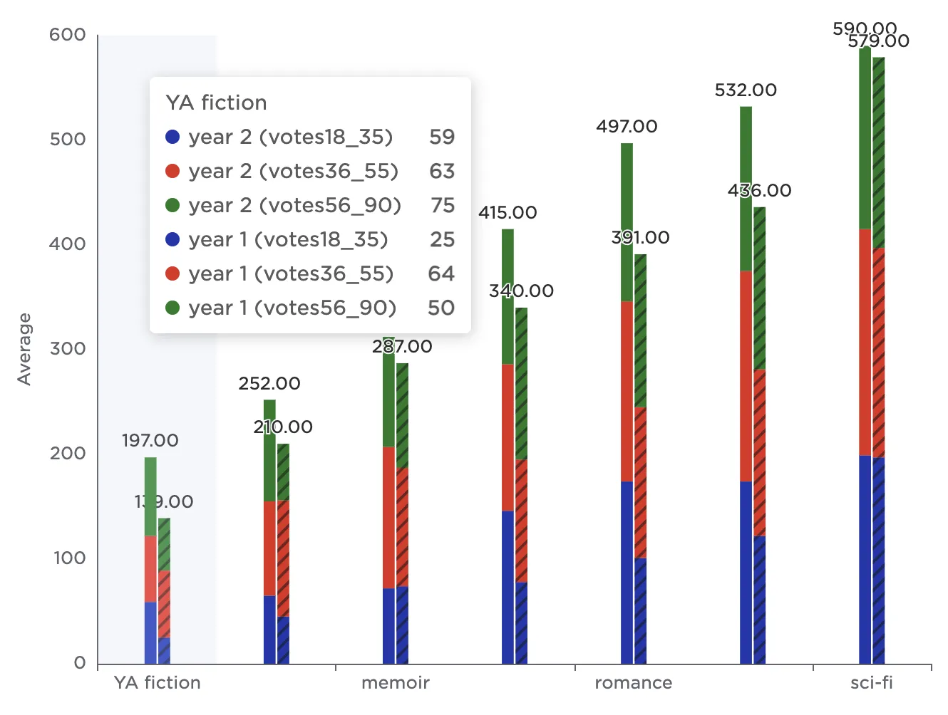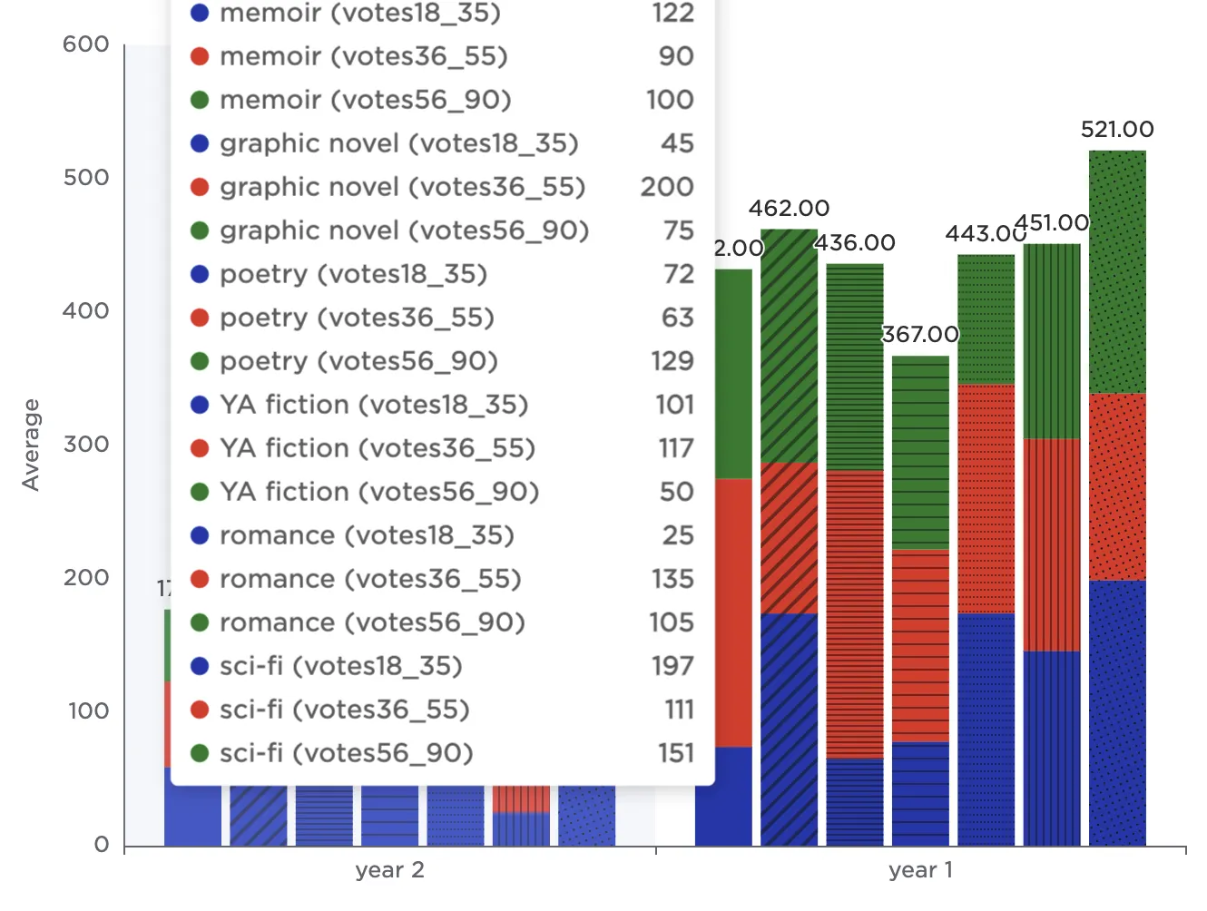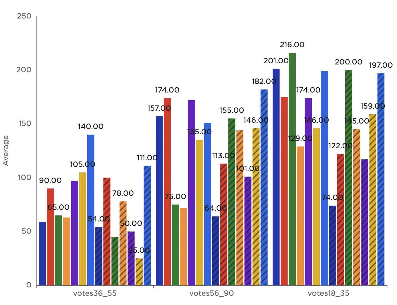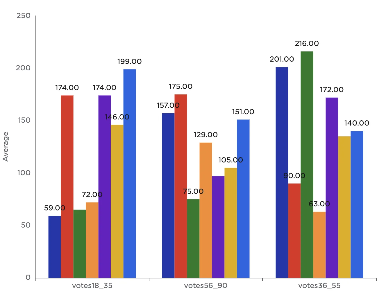 Notice that the resulting bar chart displays the average number of votes in each age group across all genres.