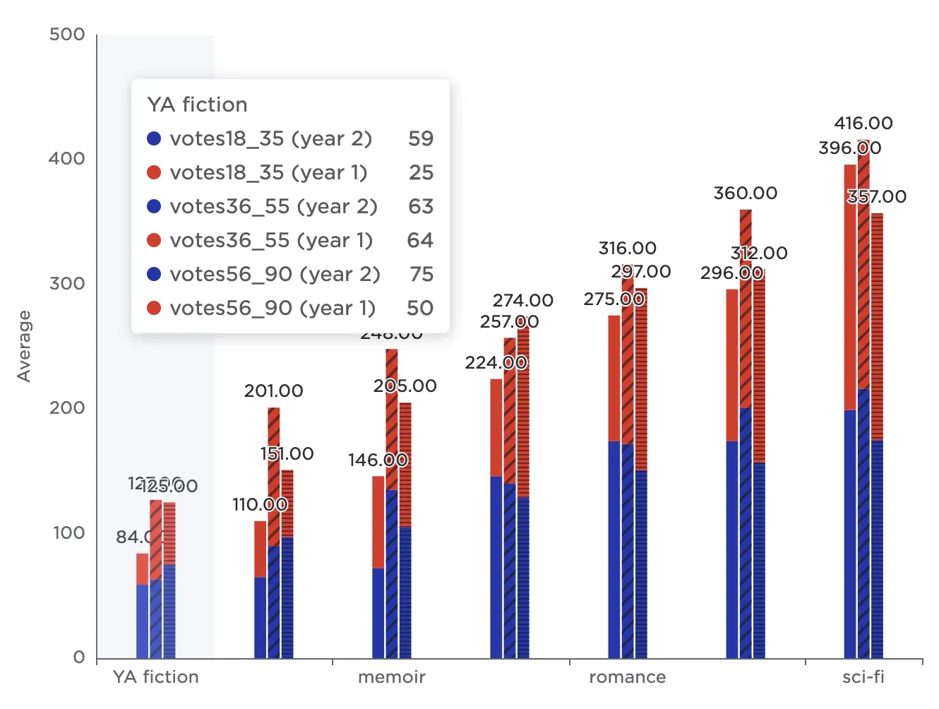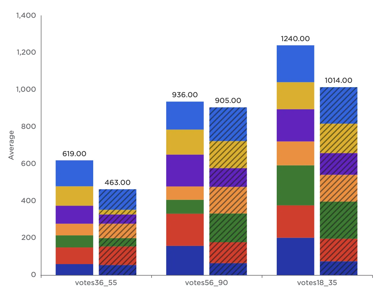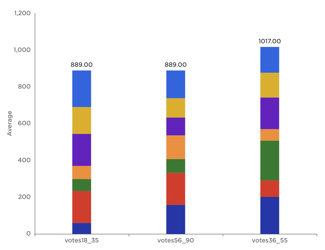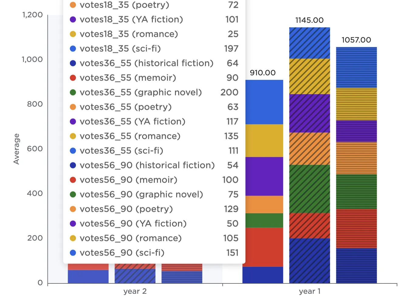 Notice that the resulting bar chart displays the average number of votes in each age group across all genres.