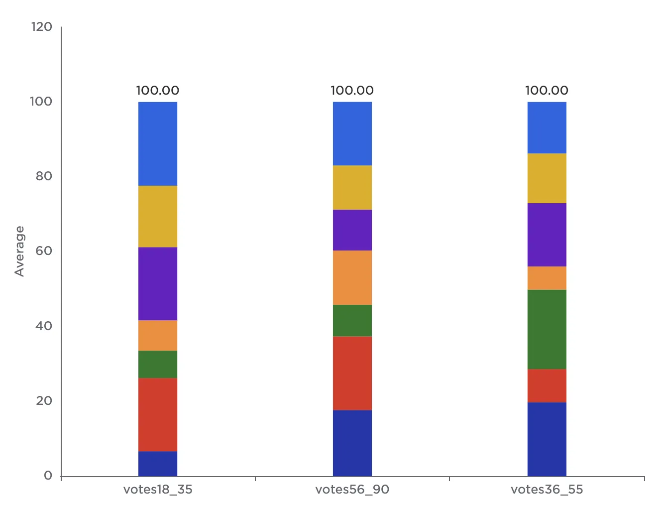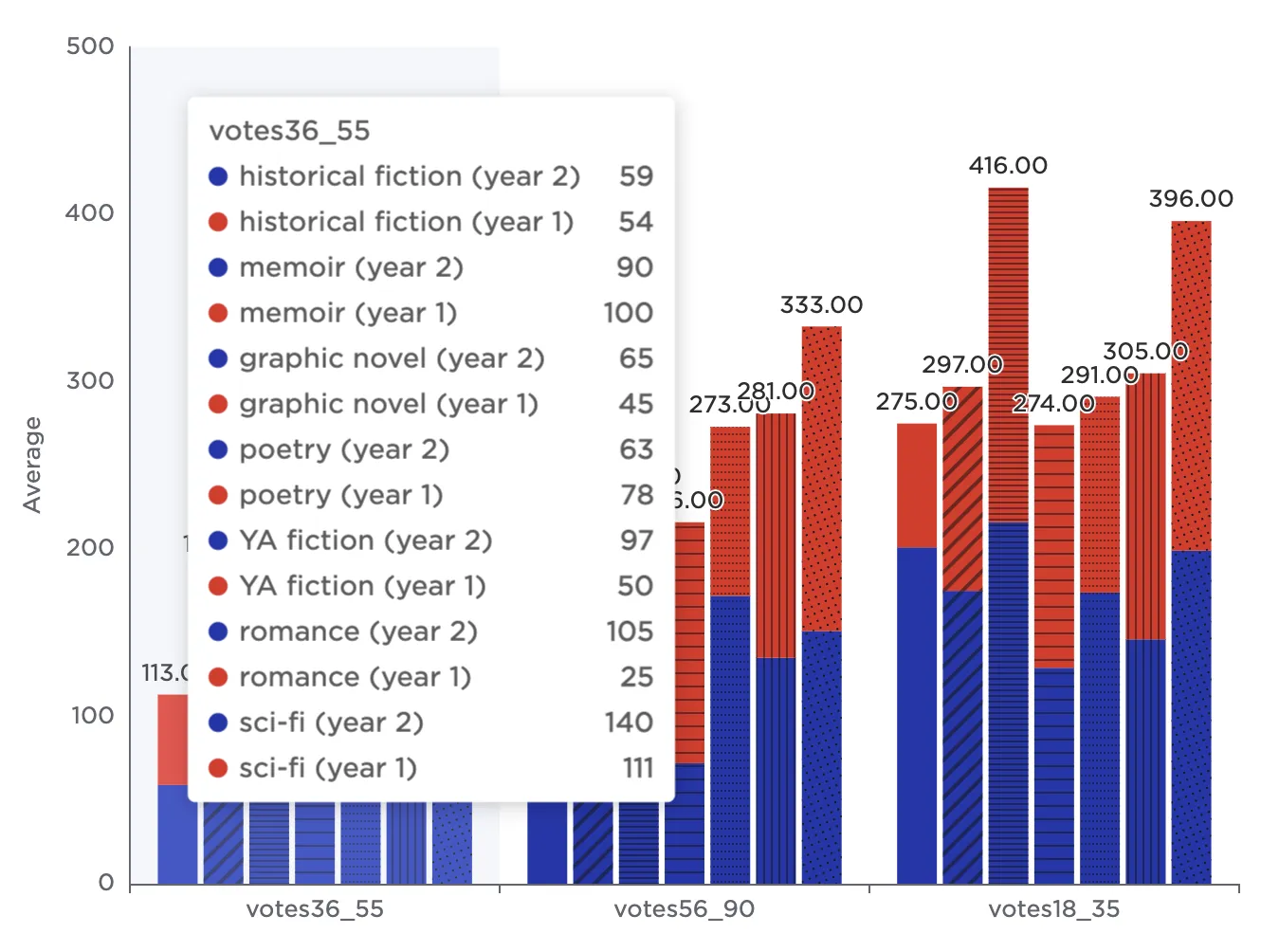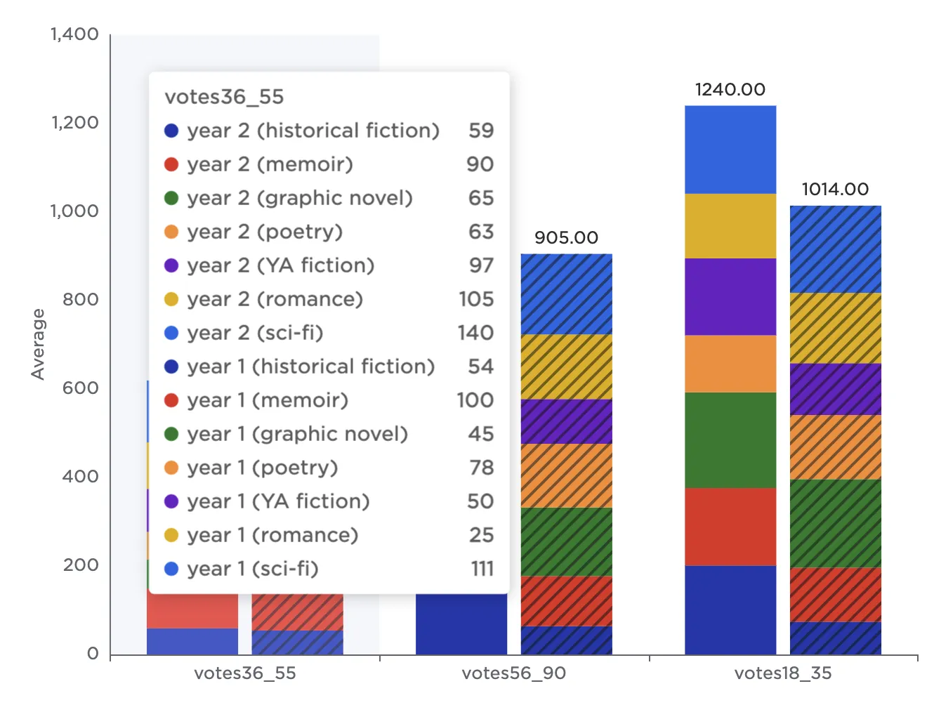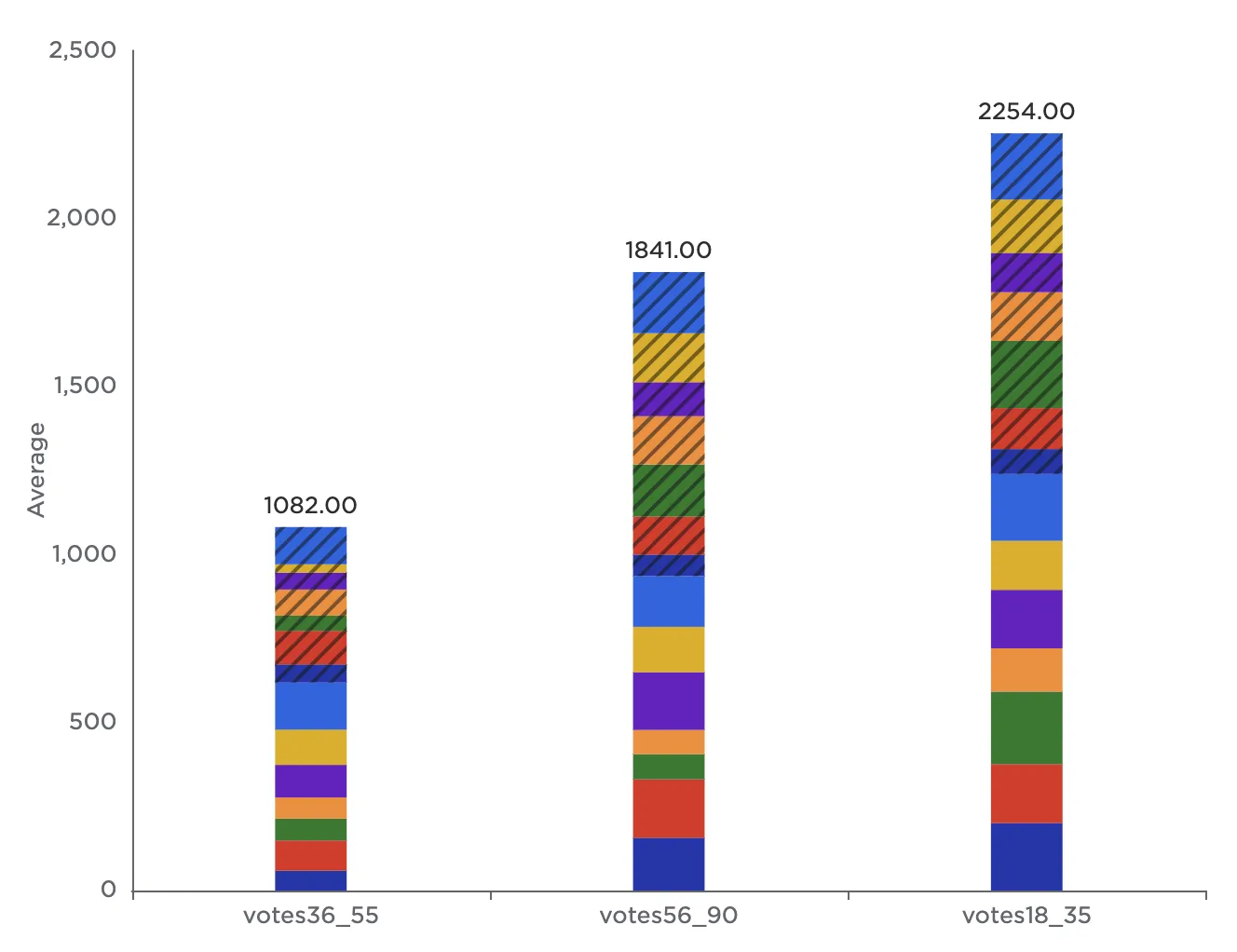 Notice that the resulting bar chart displays the average number of votes in each age group across all genres.