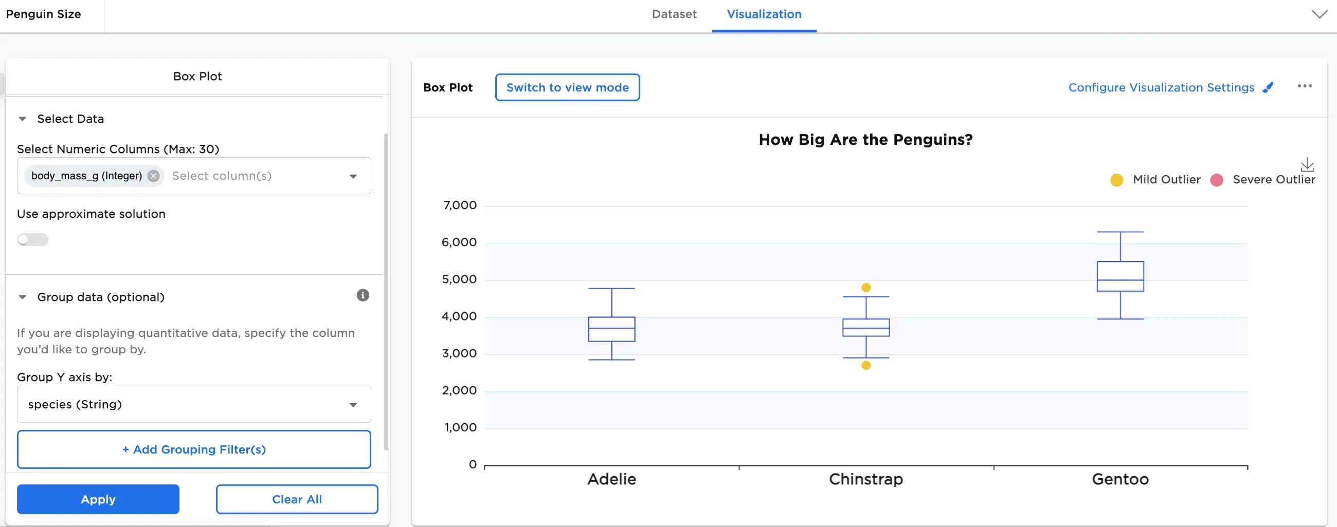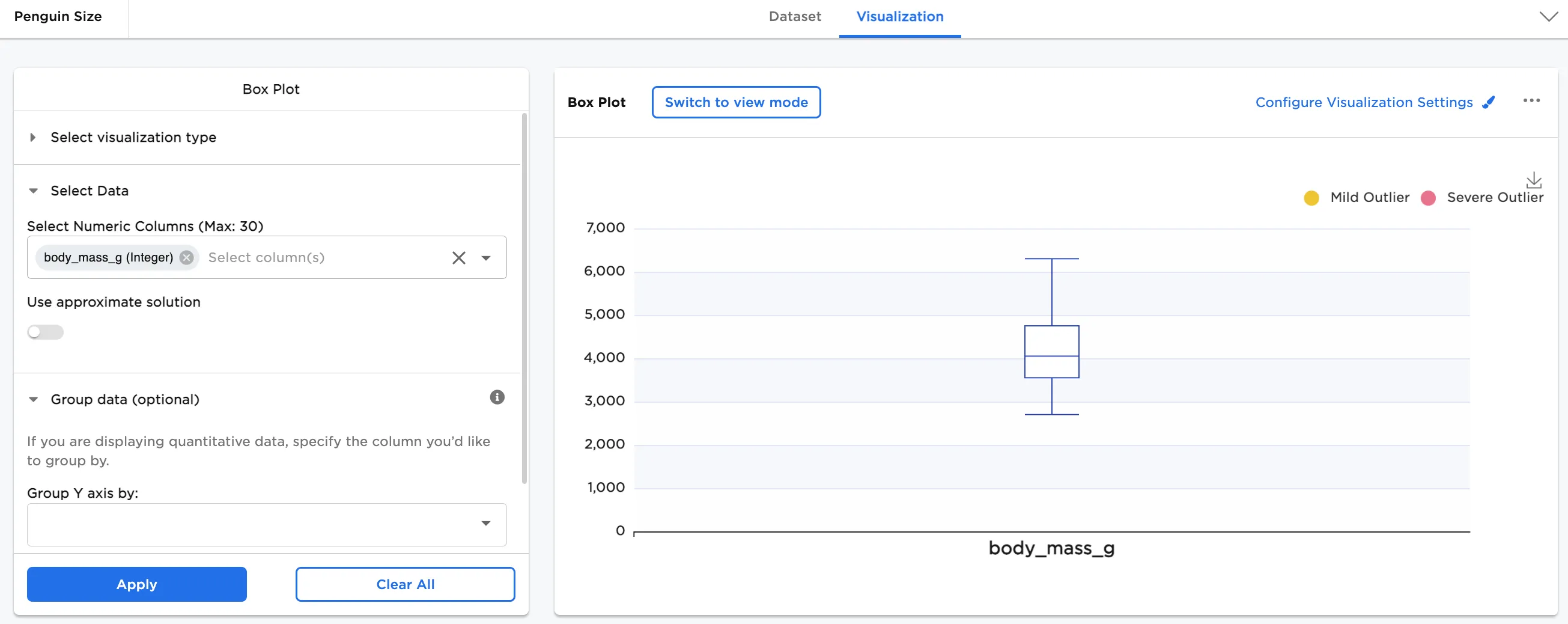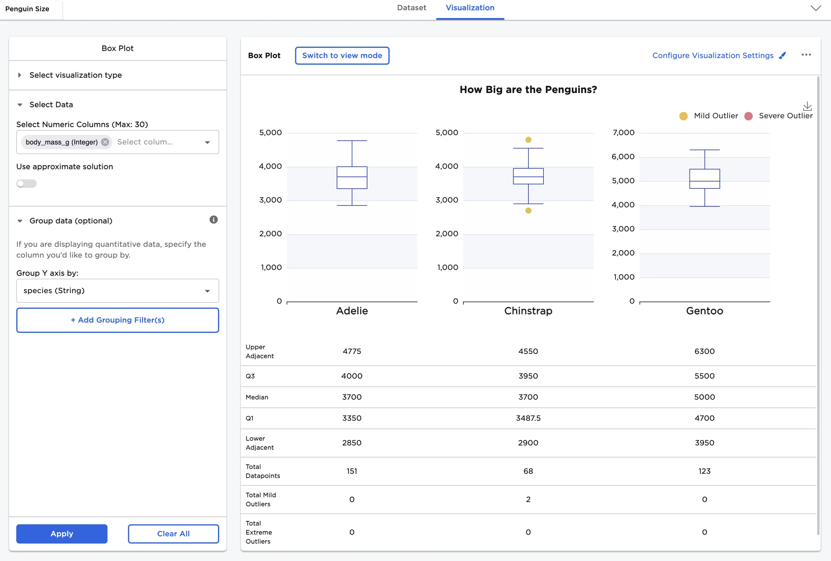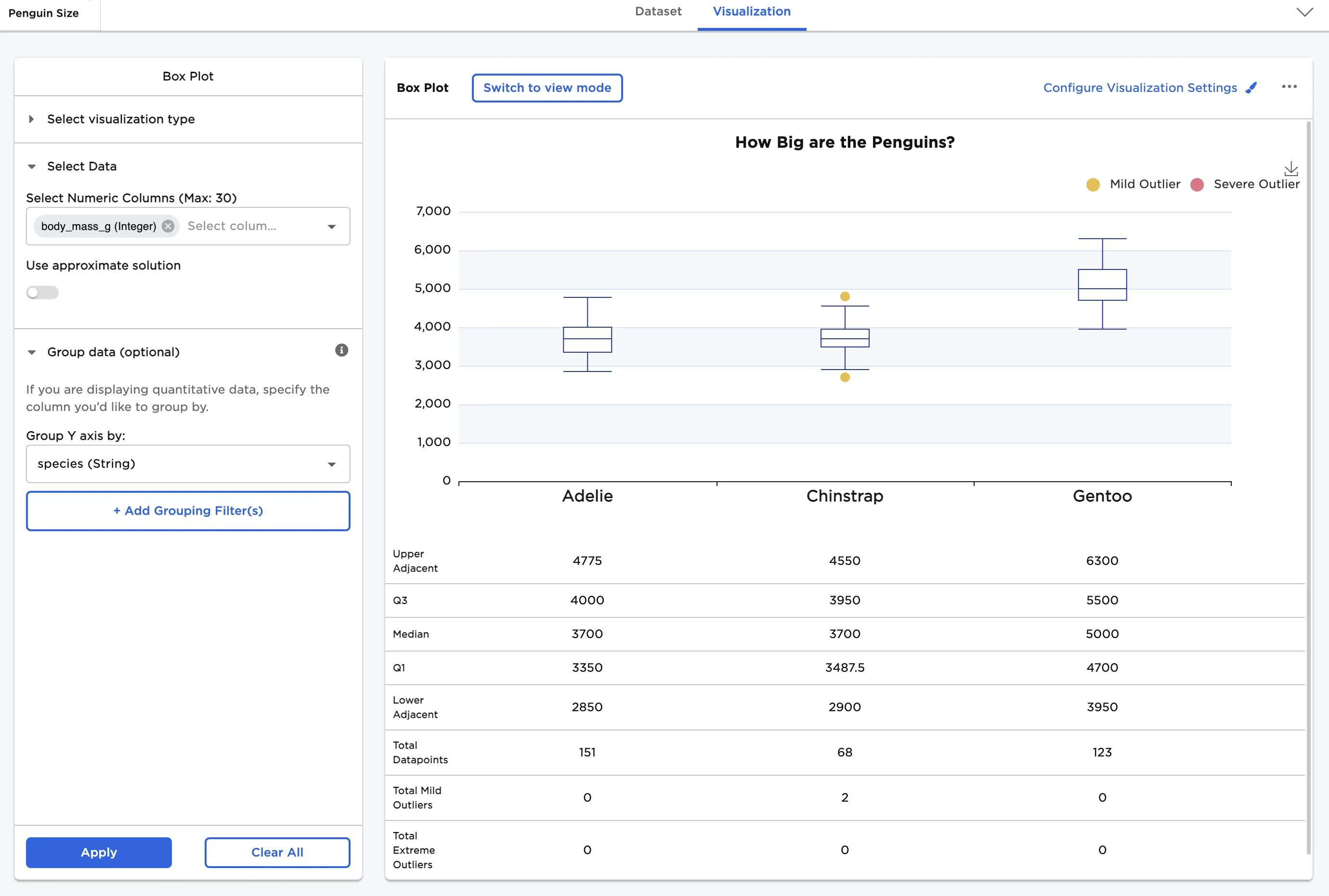 - Select one or more numeric fields to view. In this case, the "body_mass_g" field is selected.