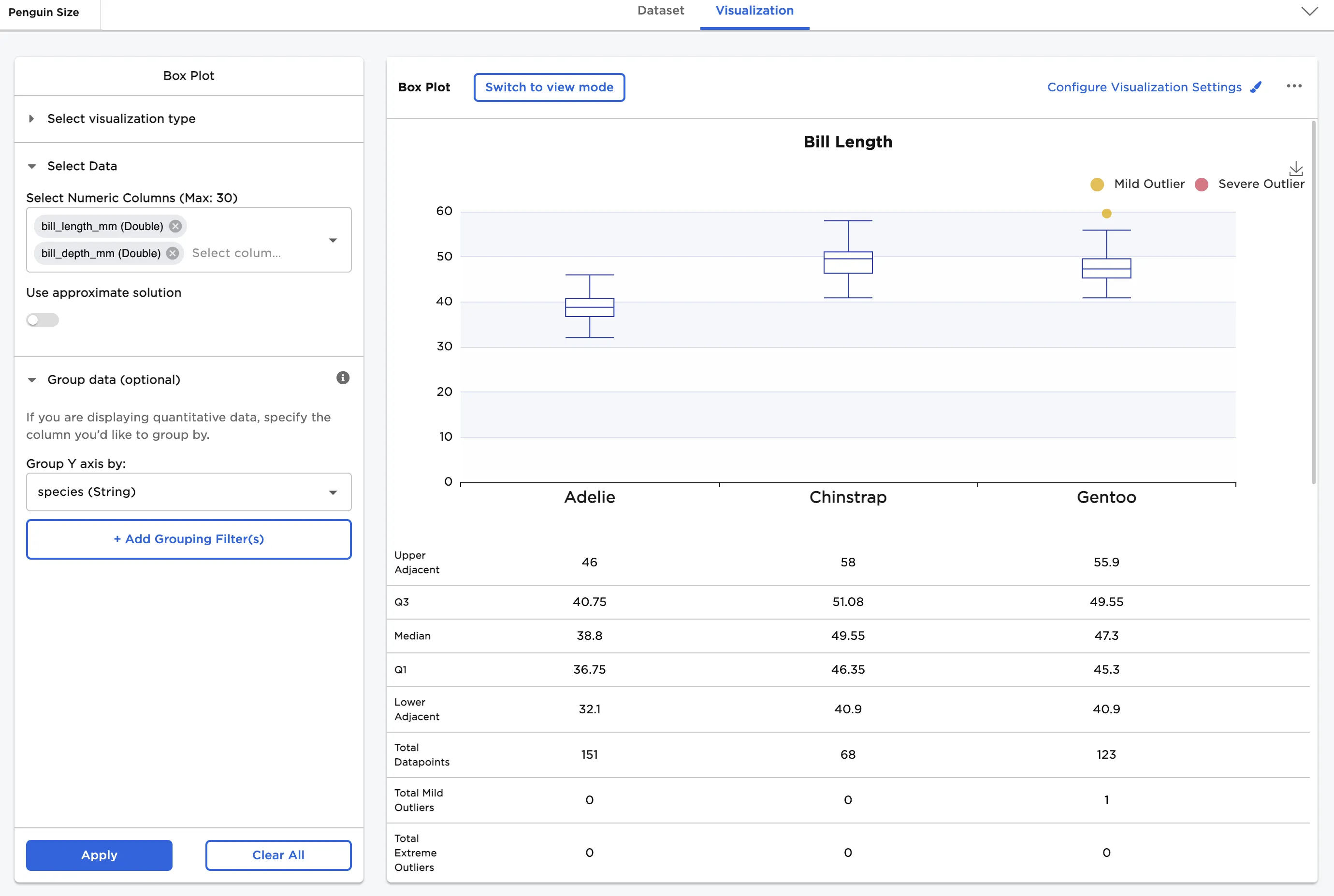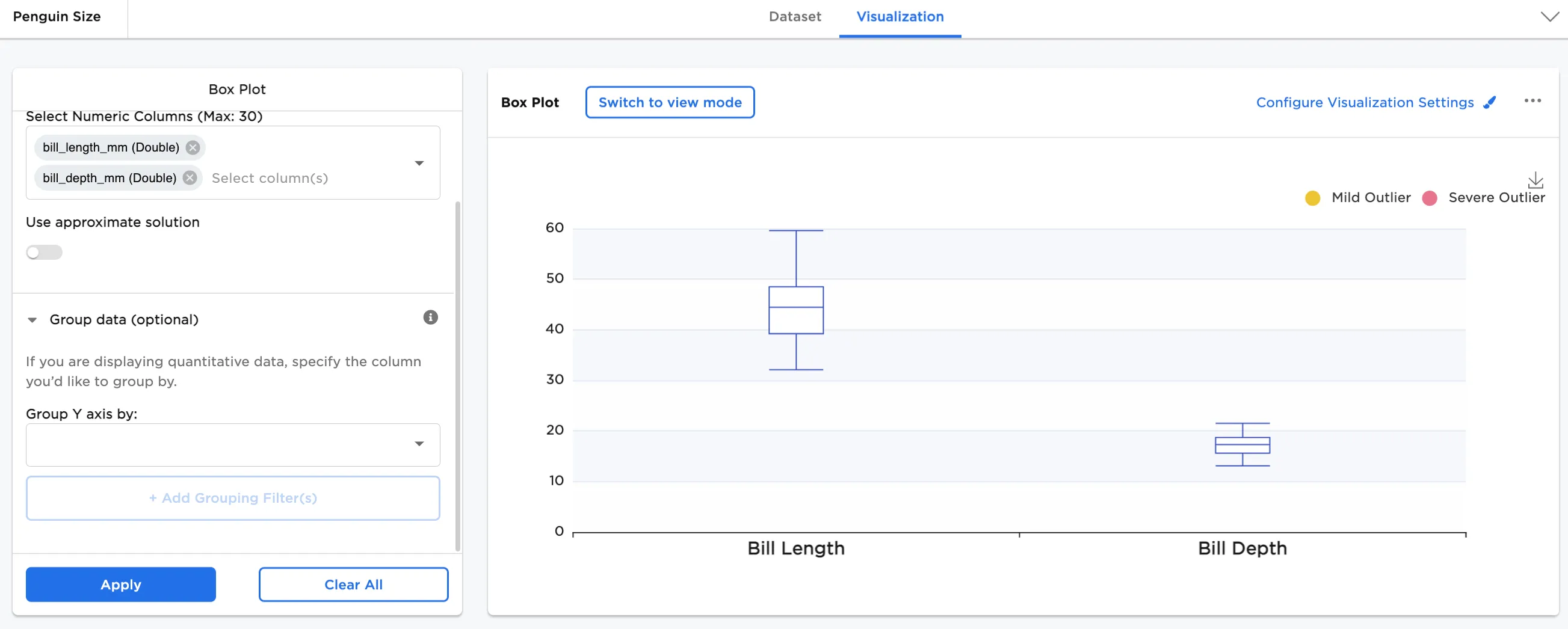 Next, a comparison of bill length vs. bill depth is shown. To create this view, select both "bill_length_mm" and "bill_depth_mm" for the Select Numeric Columns field.
