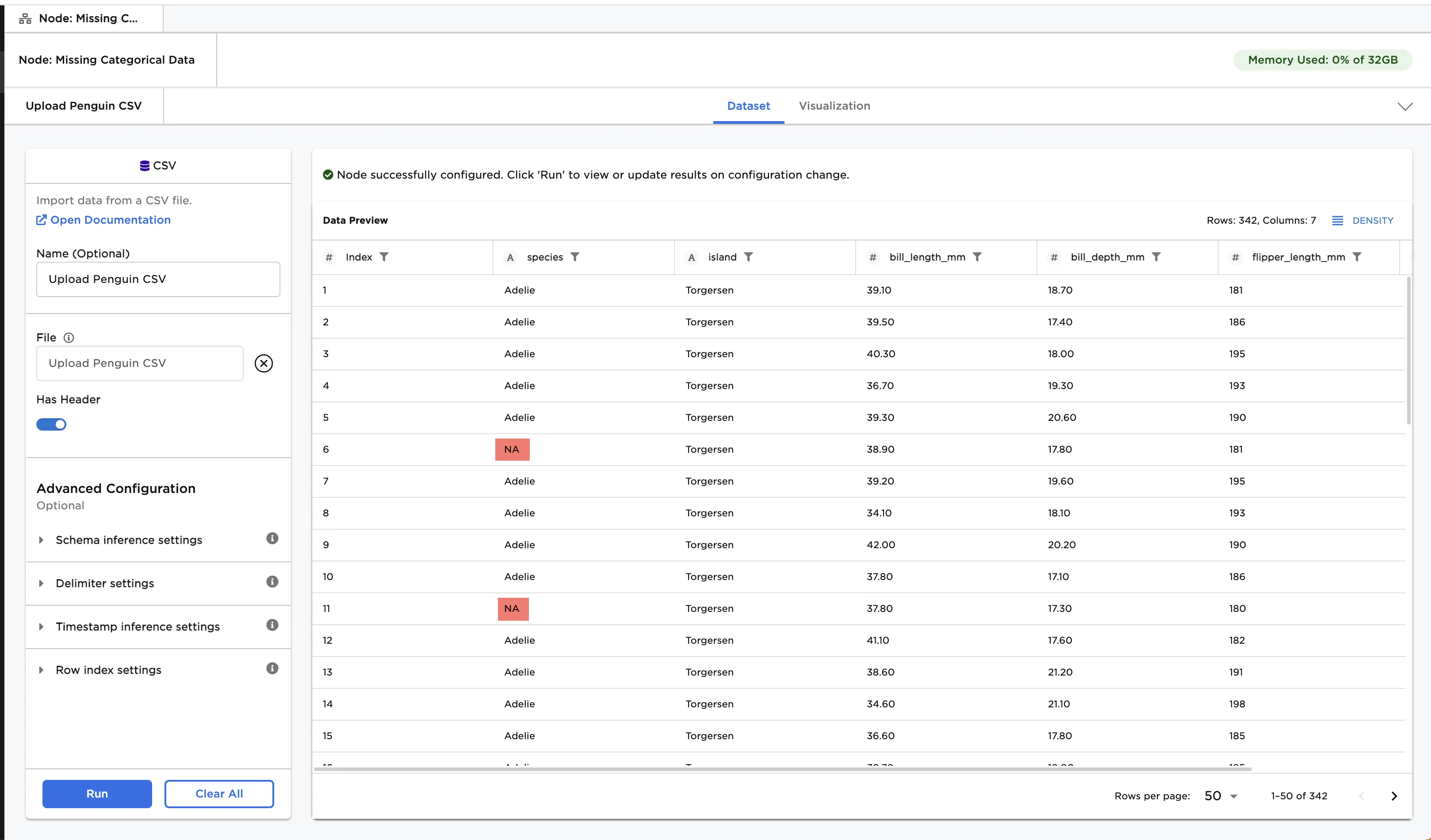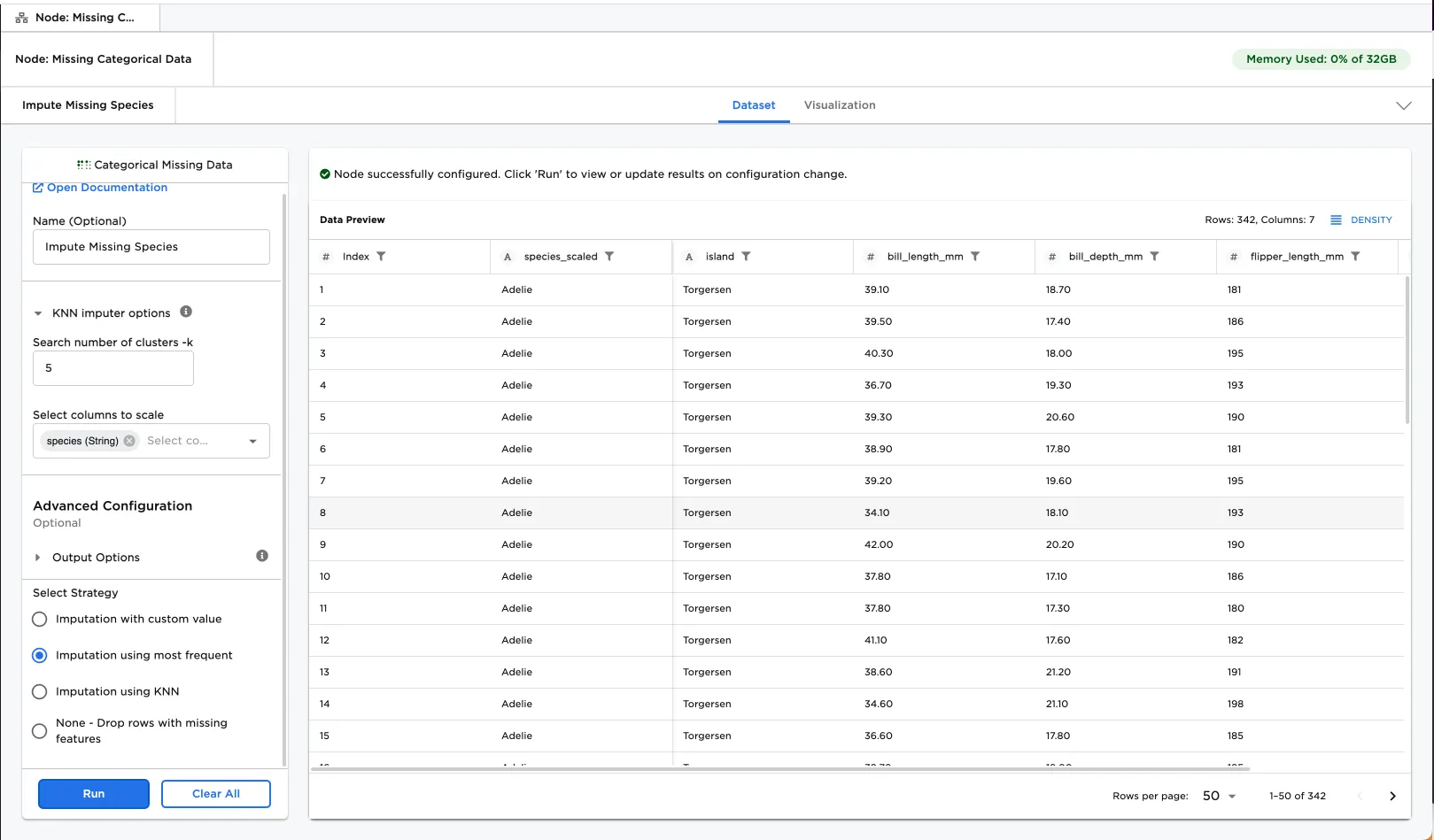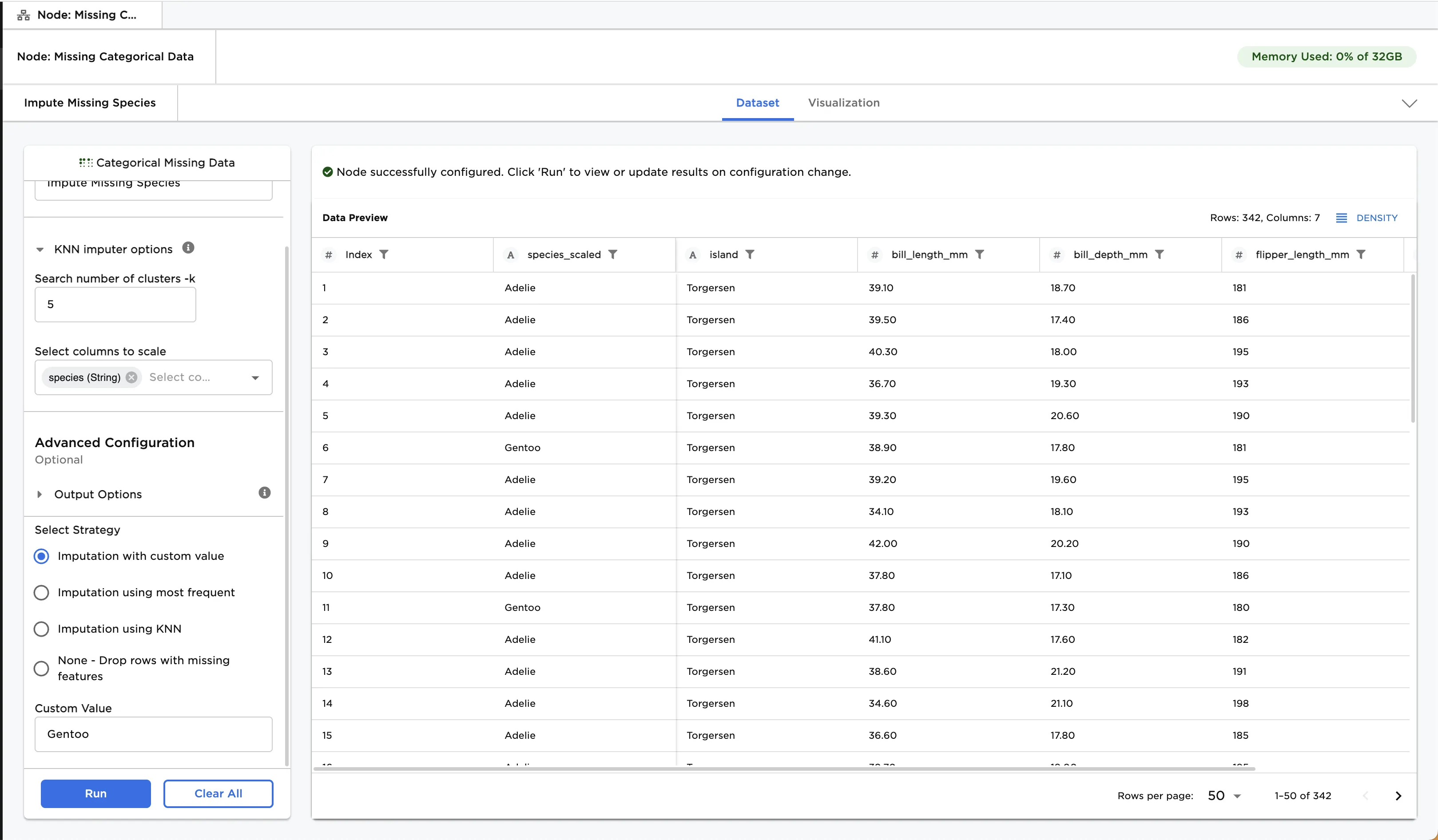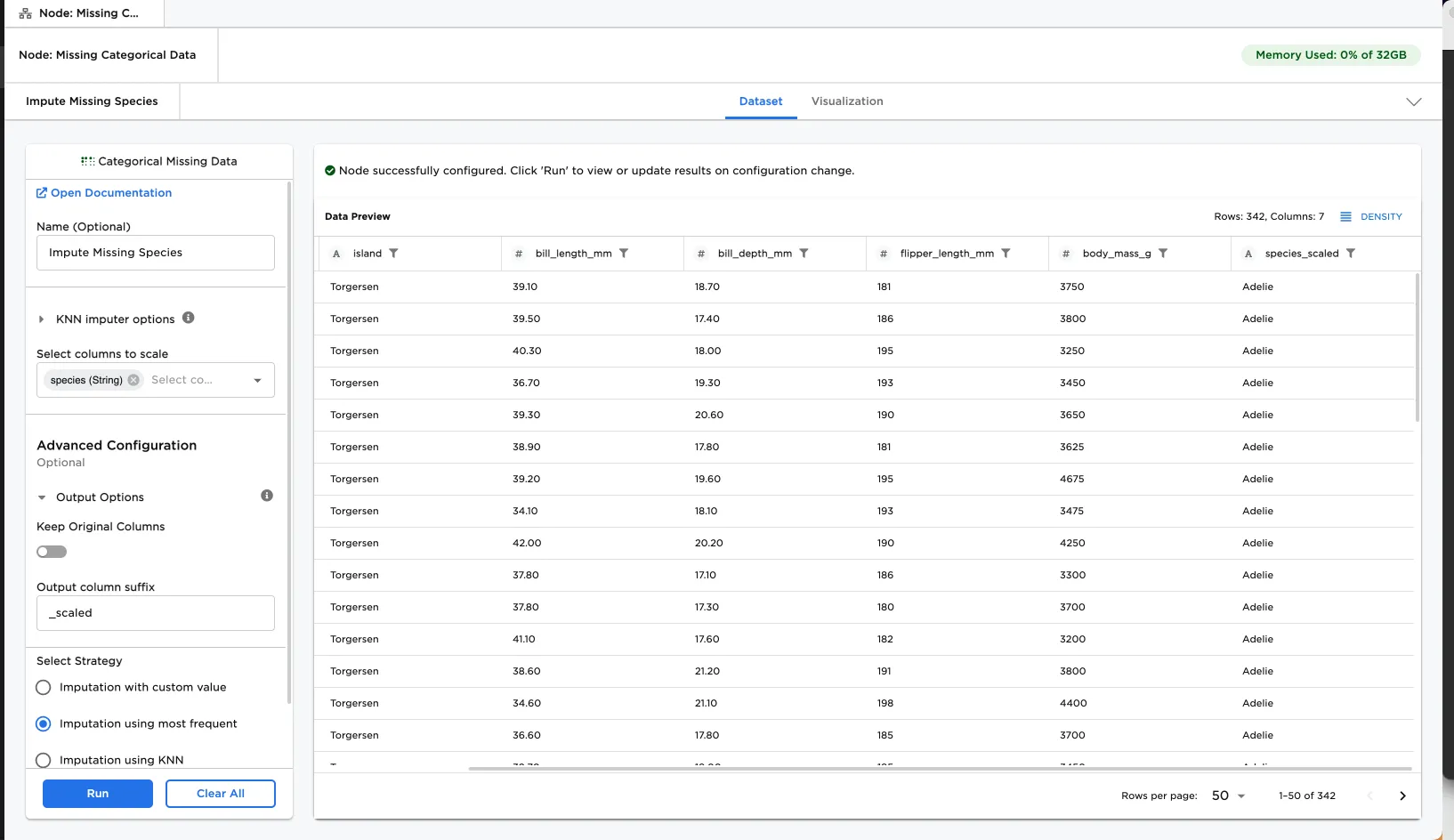 Notice that the original column is replaced with species_scaled (to keep the original column in addition to the new column, toggle Keep Original Columns on). The missing values are filled in with the custom value of Gentoo.