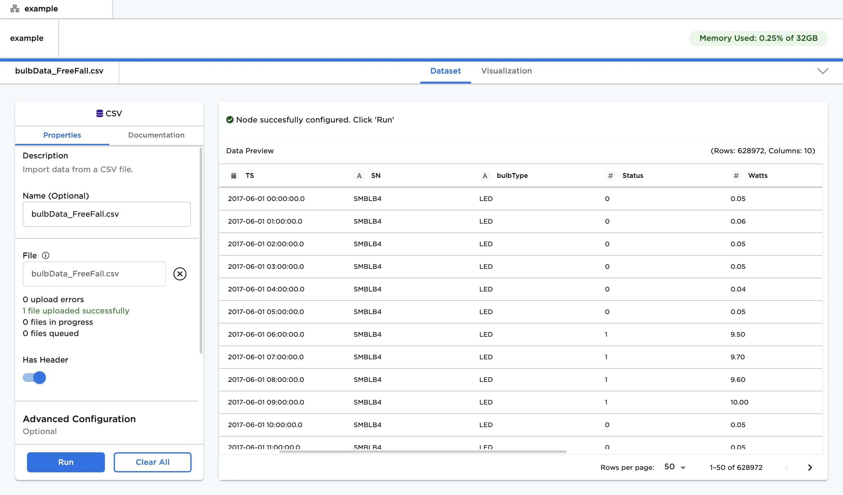 - Upload this file then select "Run" to create a dataframe with the default settings.