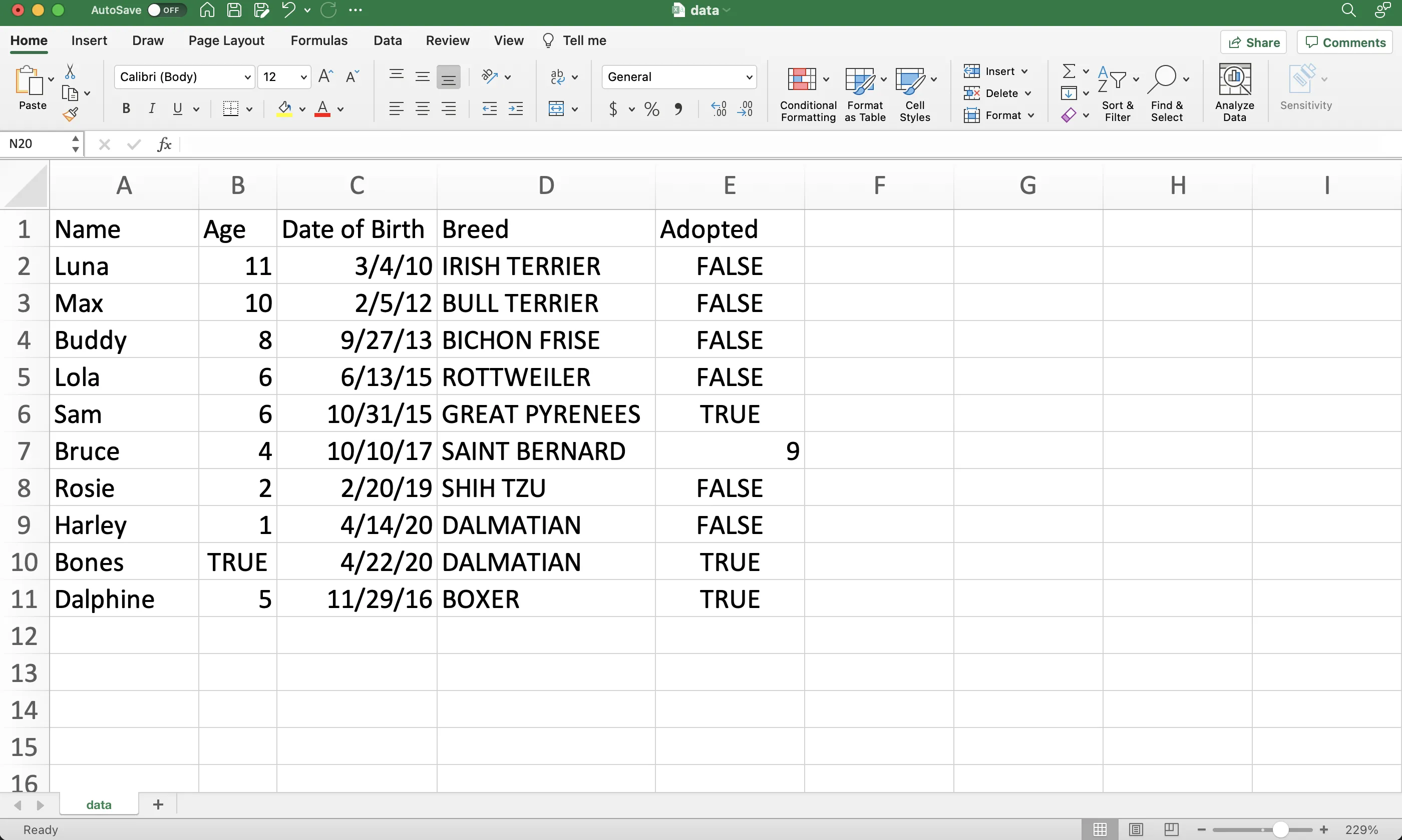 - The file shown below is used in this example. Notice that there are eleven rows of data, including the column labels in the first row.