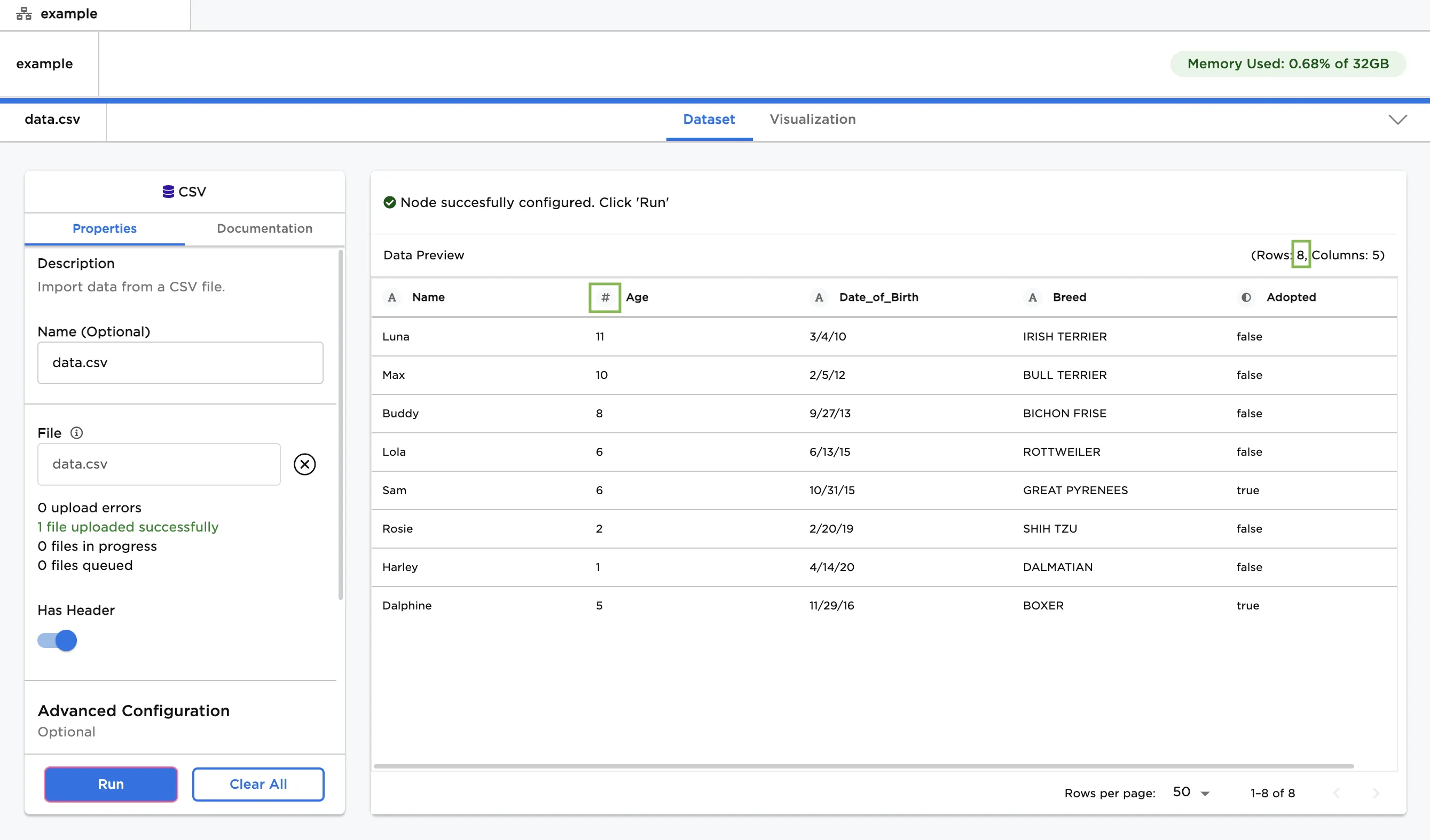 - By default, Visual Notebooks drops rows with missing values or mismatched data types. Since there are only eight rows in the dataframe, two rows have been dropped.