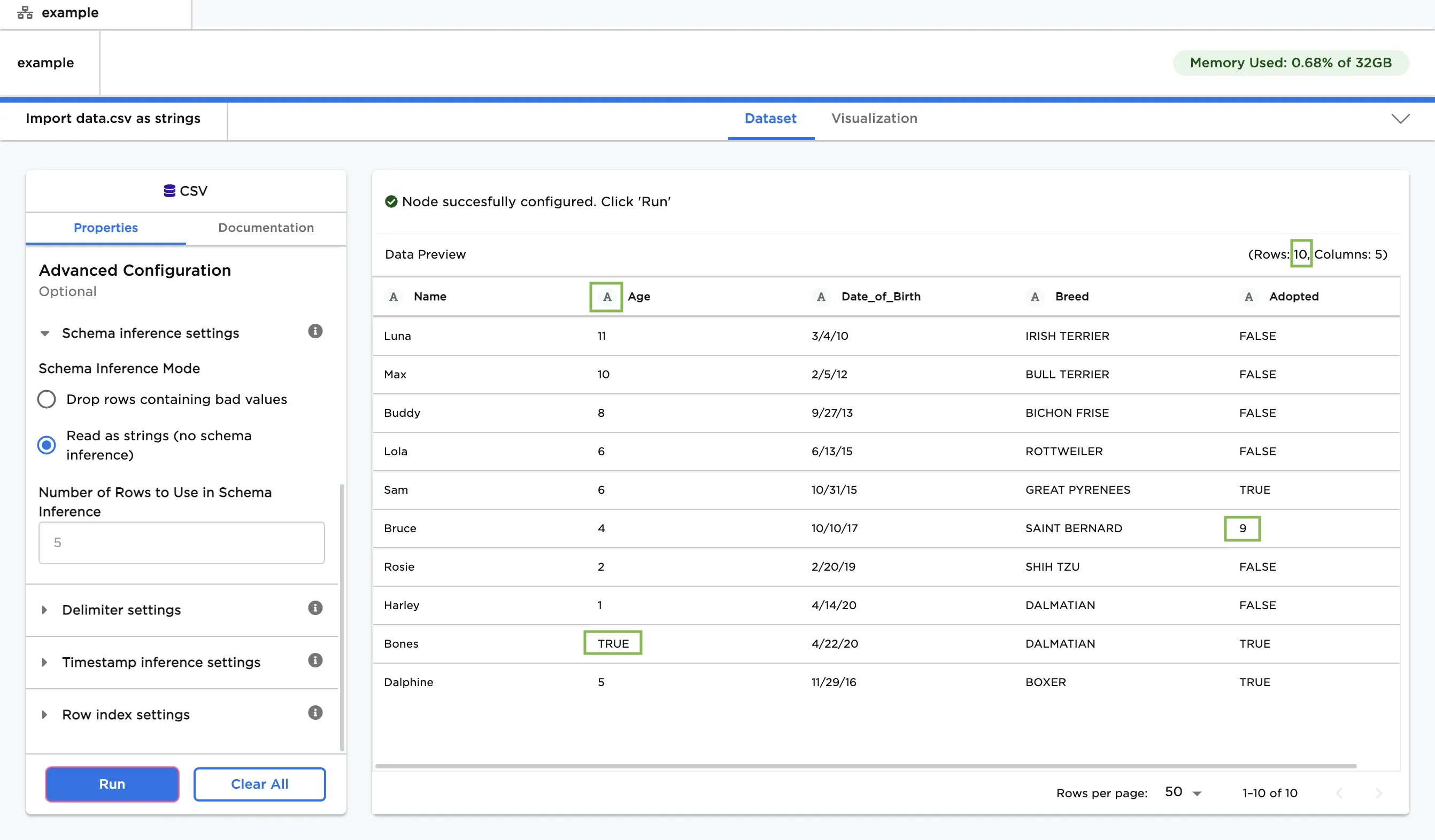 Select the Drop rows containing bad values option to infer the data type (string, integer, decimal, Boolean, etc.) used in each column. Rows with different data types or empty values are not uploaded to the workspace. Select the Read as strings (no schema inference) option to read all columns as strings and upload all values. | |