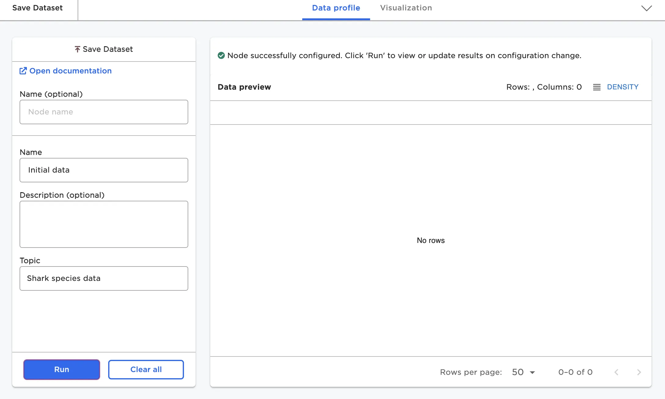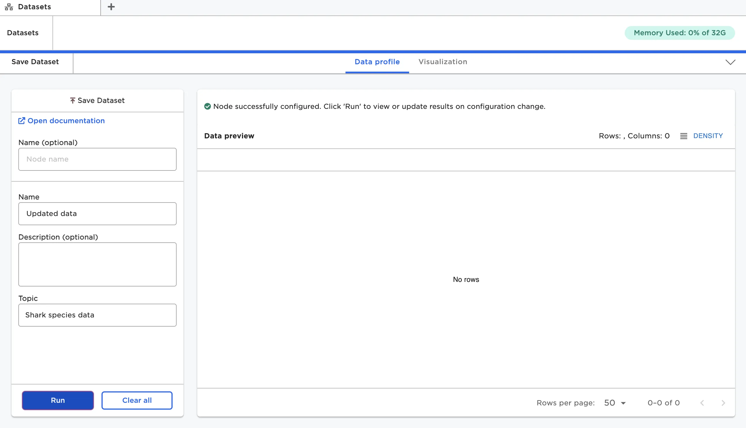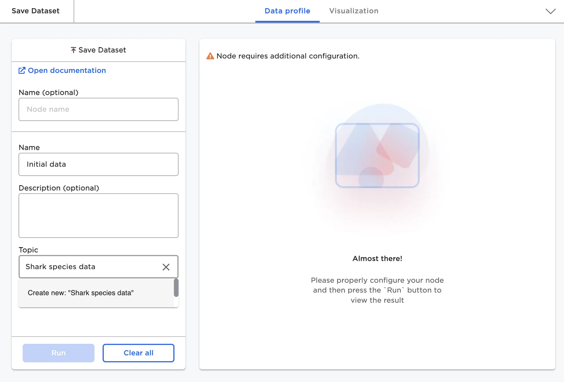 When using the Save Dataset node, it is best to think of the Name field as the version name, and the Topic field as the overall name of the dataset. When creating a new dataset, make sure you select Create new after entering a name in the Topic field. The Run button appears grey until Create new is selected.