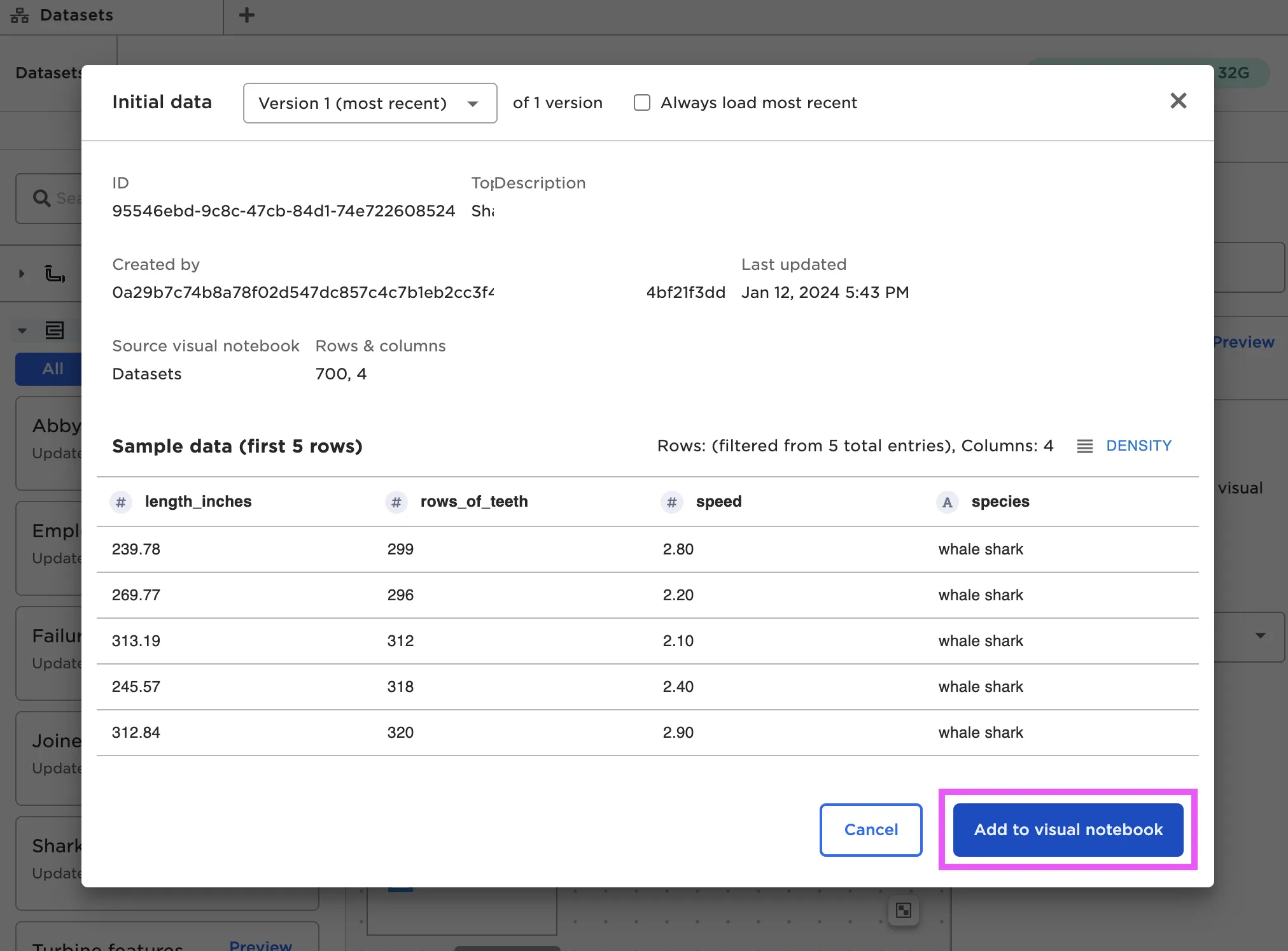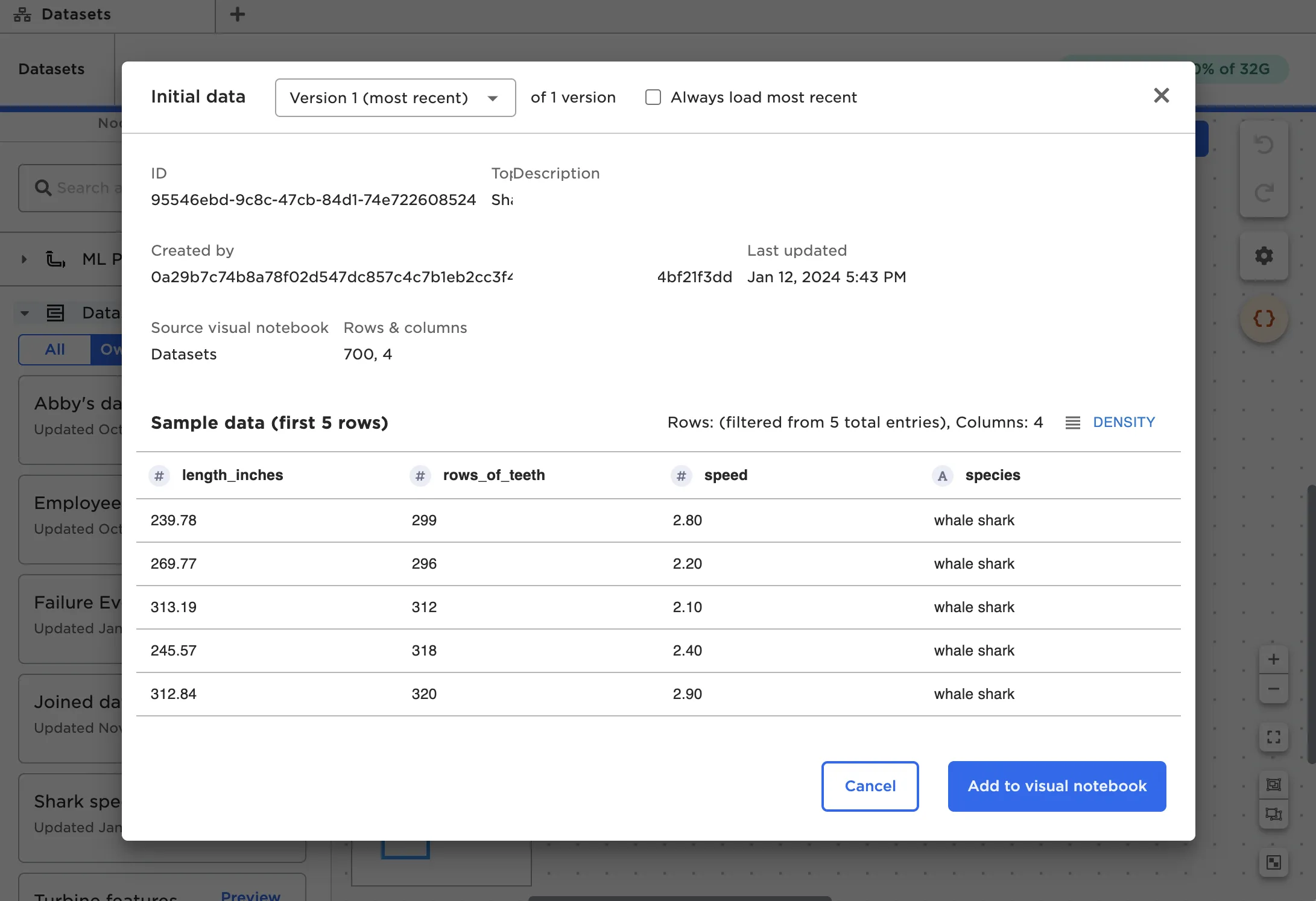Visual Notebooks datasets are versioned, reusable, and shareable snapshot of your data. Use Visual Notebooks datasets to access your data across multiple visual notebooks and ML pipelines.