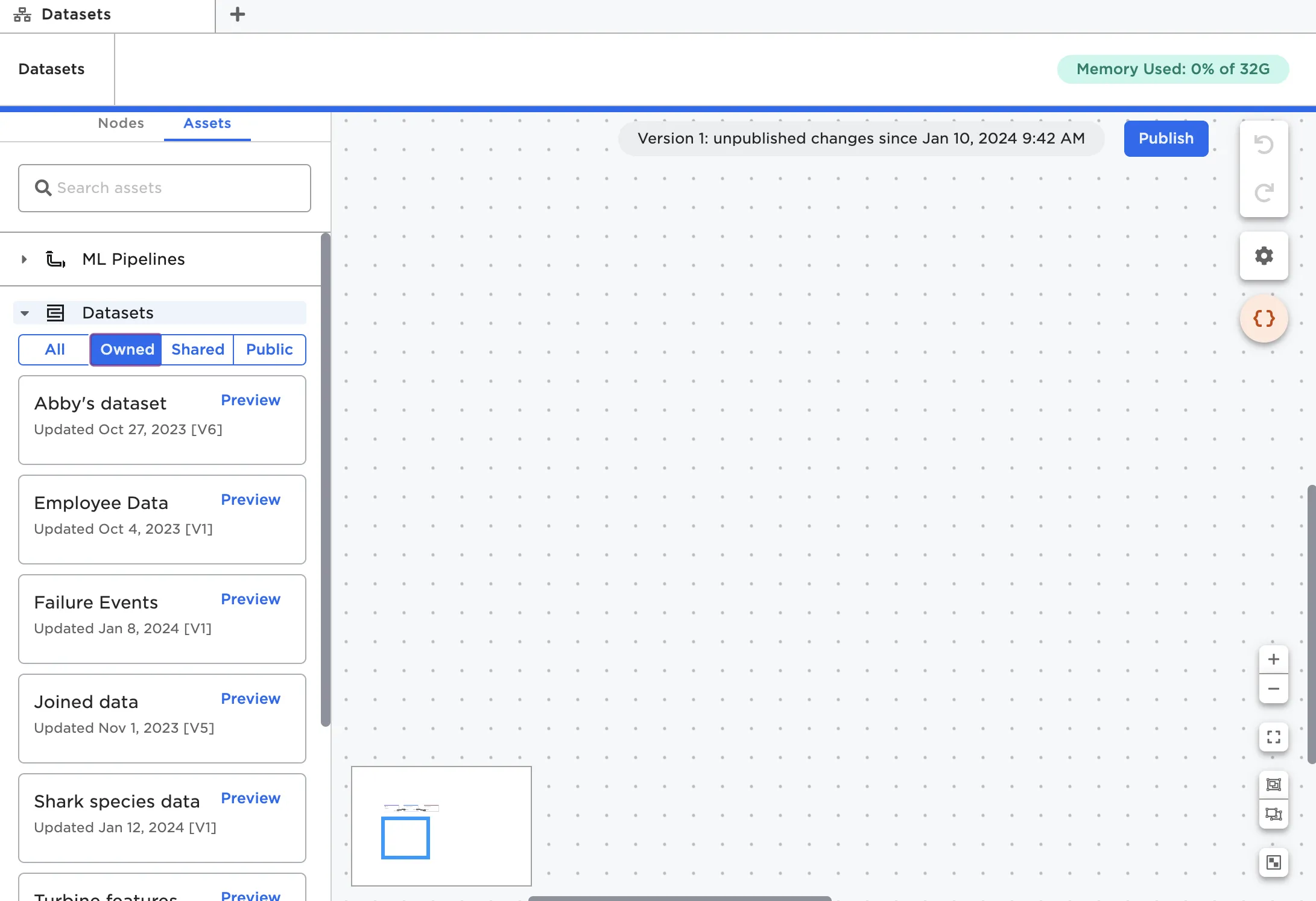 After datasets are created, they can be used as a node in visual notebooks and ML pipelines. From a visual notebook or ML pipeline, switch to the assets panel and expand the Datasets section. Find the dataset you'd like to use and drag it onto the canvas in the same way you would a node.