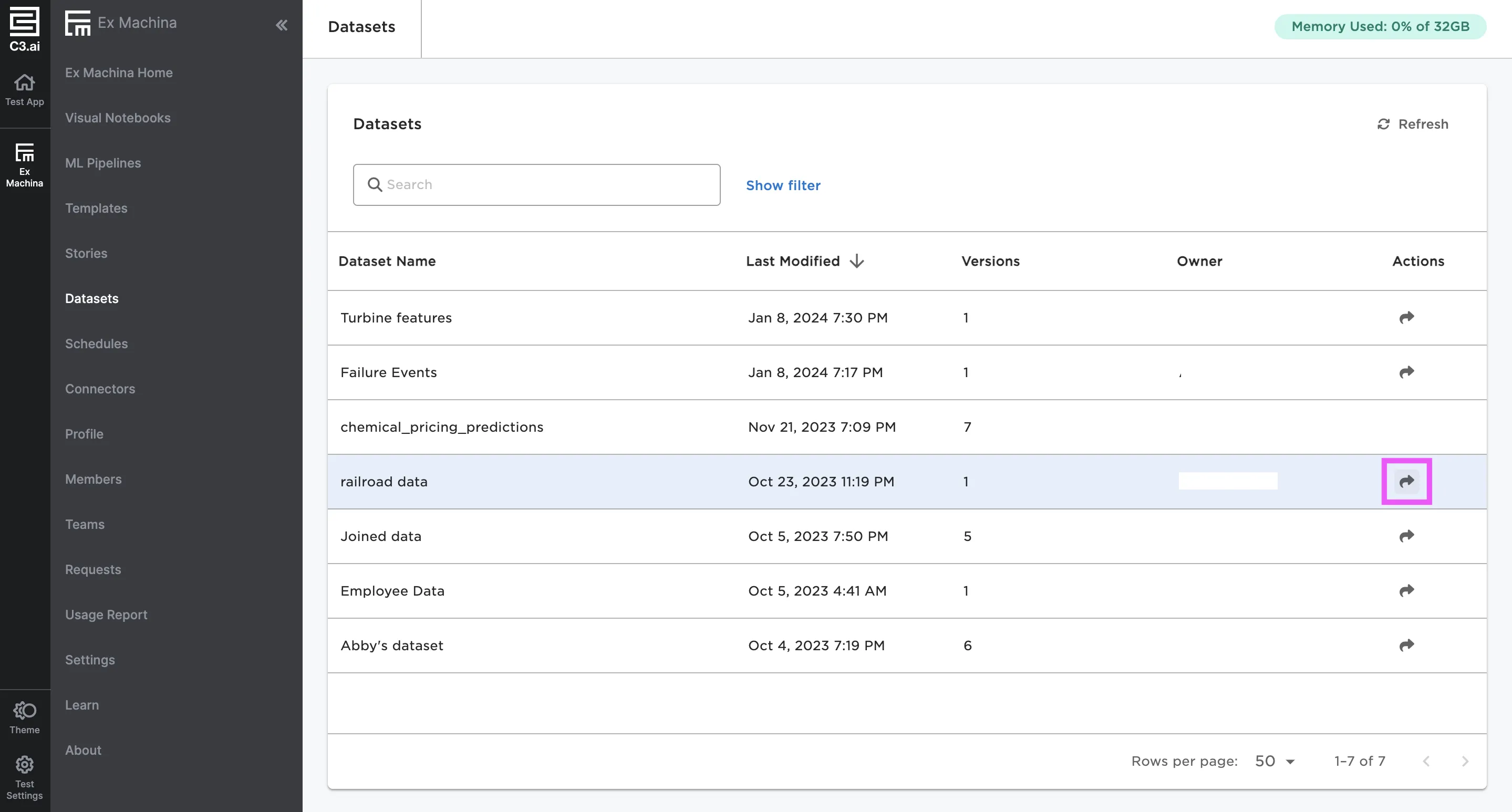 To share your dataset with others, expand the sidebar and navigate to the Datasets page. Select the arrow beside a dataset to share it.