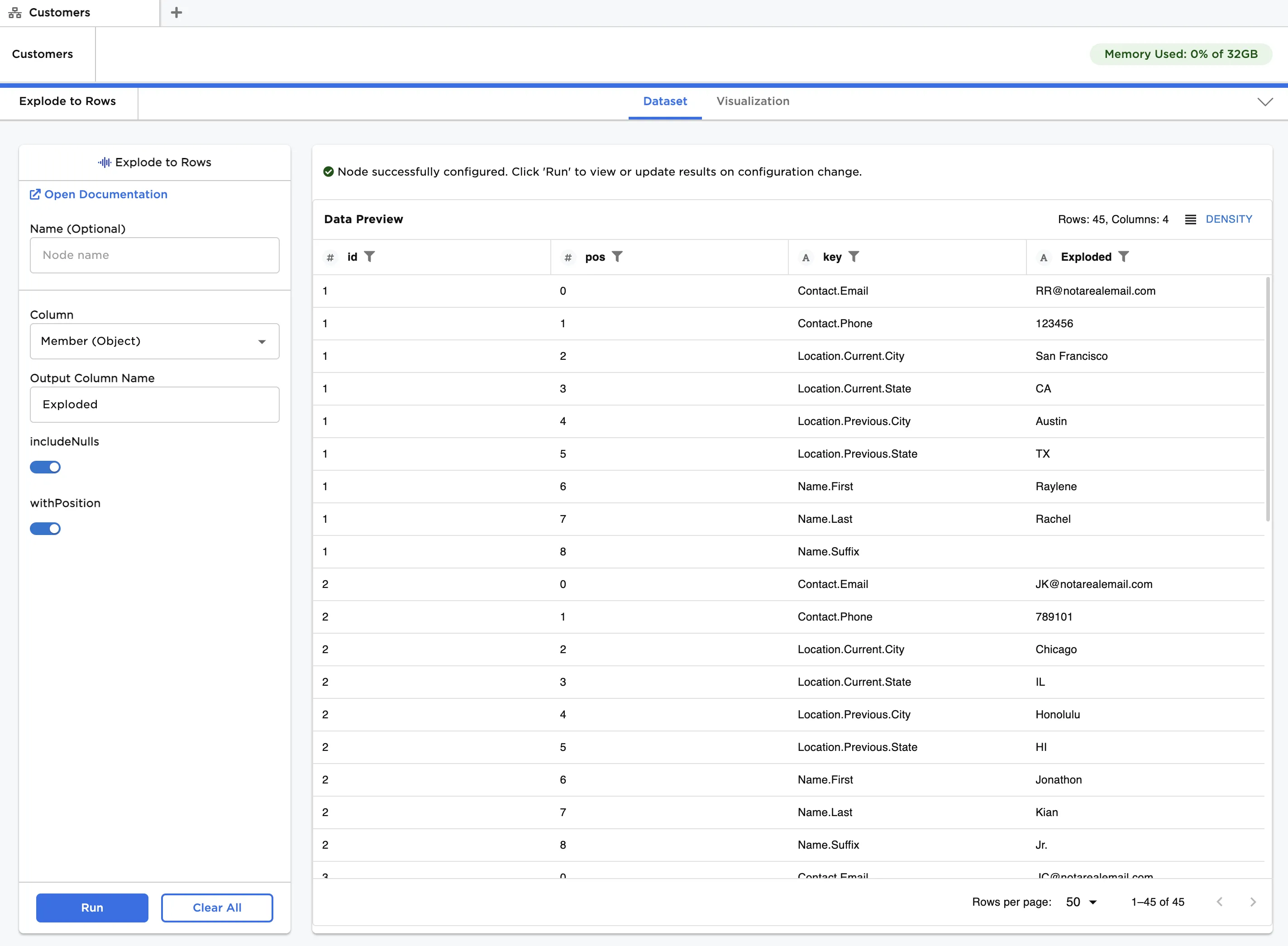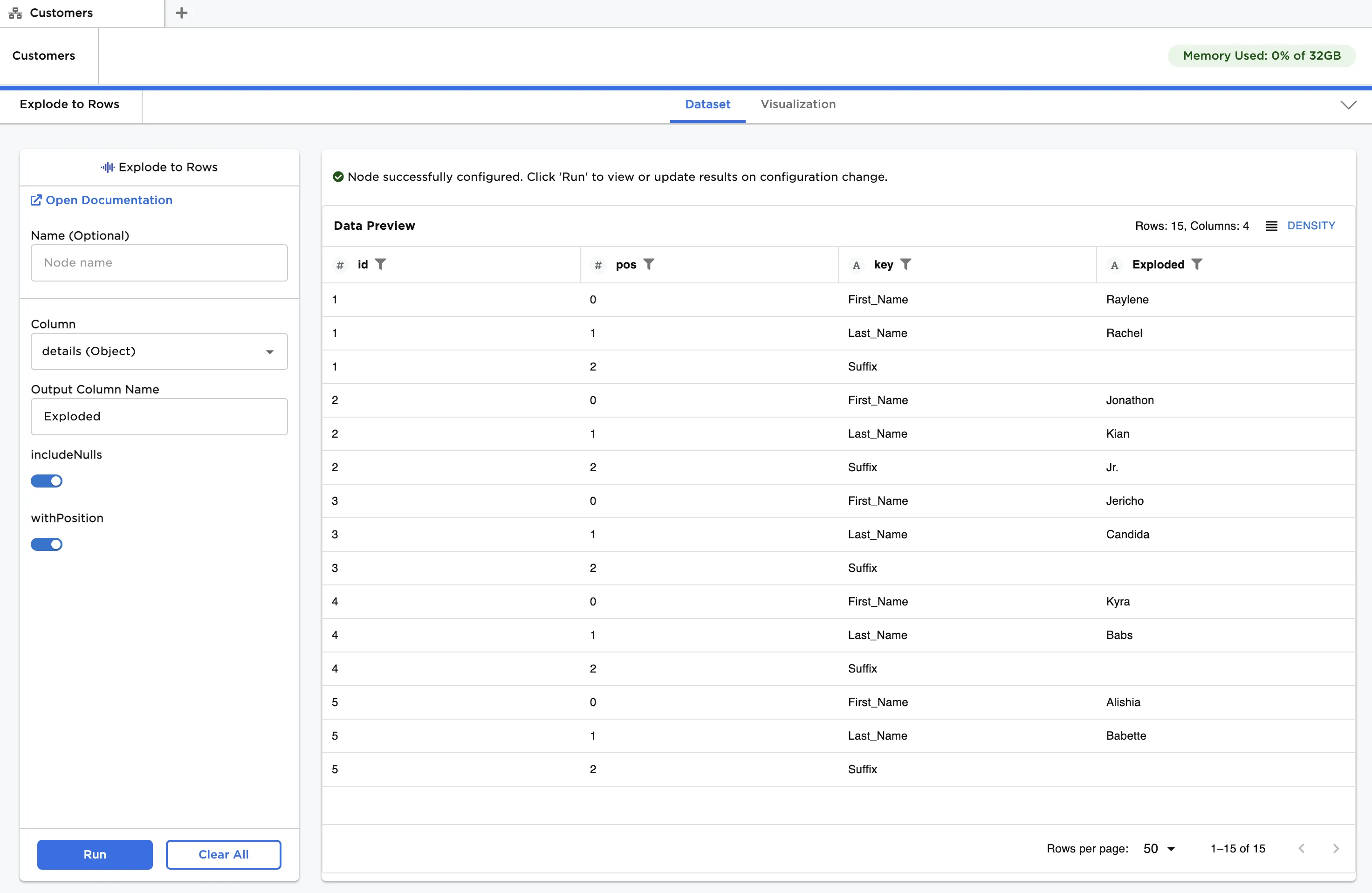 After running the node, the values for every key/value pair can be seen in the "Exploded" column as shown in Figure 3. The key is indicated in the "key" column. There are two additional columns that together identify the position of each key/value pair in the original dataframe: "id" and "pos". Note that "id" is part of the original dataframe, whereas "pos" is an output of the Explode to Rows node. The "id" column indicates which row, and correspondingly, which specific Object the pair is extracted from. The "pos" column indicates the pair's index position within the Object. Observe that there are now 15 rows, equivalent to the total number of key/value pairs in the input dataframe.