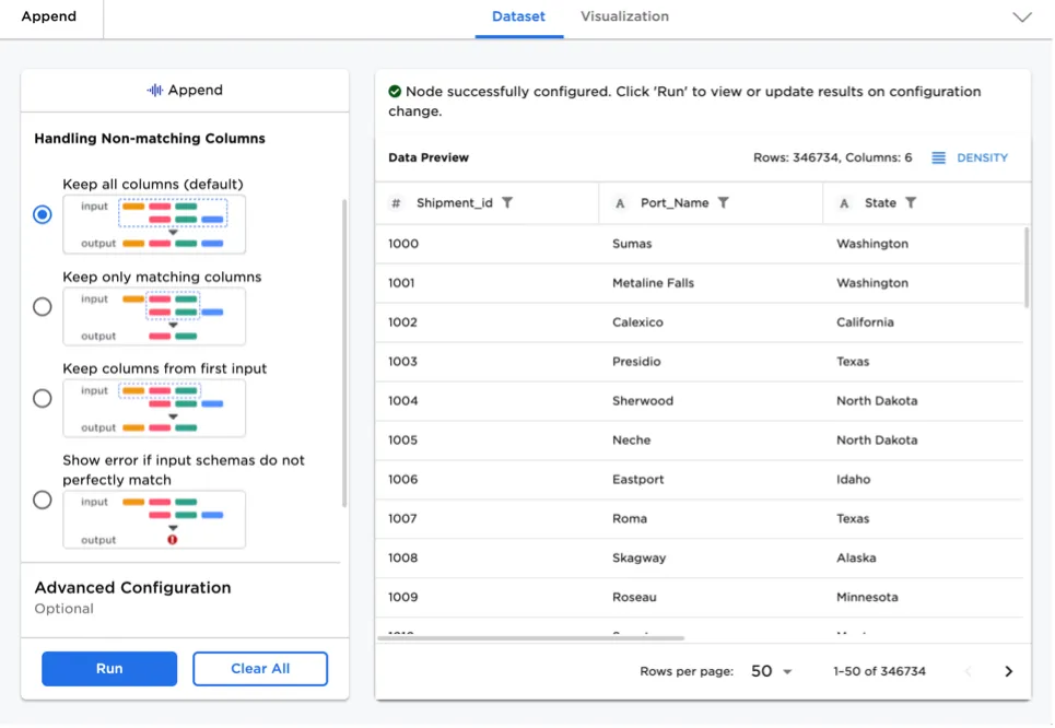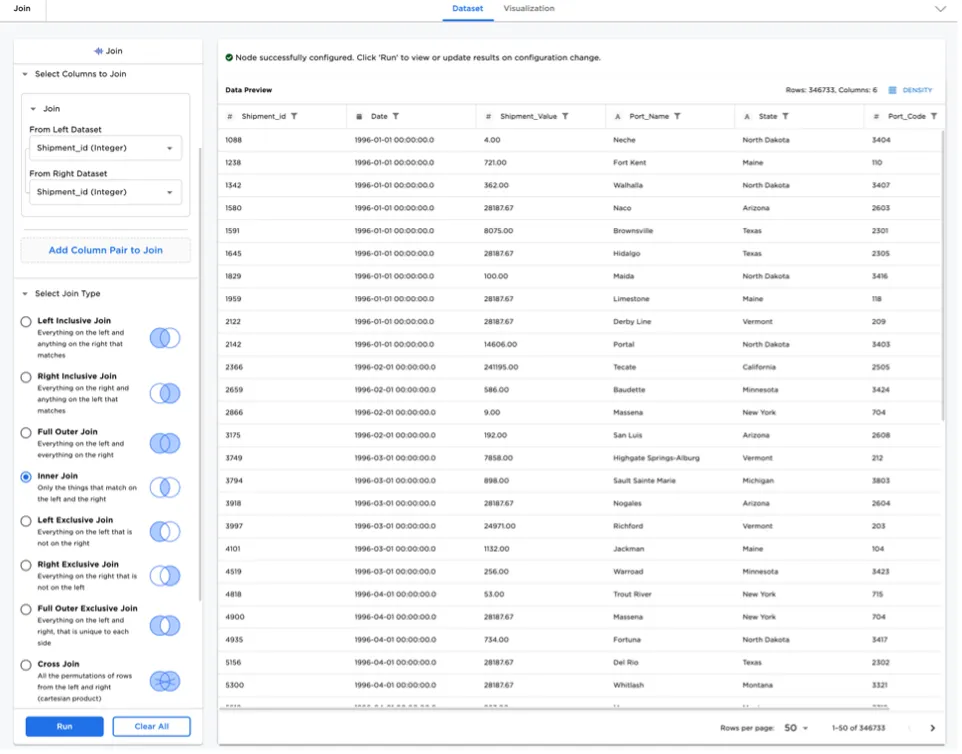 Appending/concatenating, joining, and pivoting data are some of the most common data operations for any data science project. Visual Notebooks offers visually rich interfaces for performing these common operations. End users do not need to remember the difference between different join types, as Visual Notebooks guides the user.