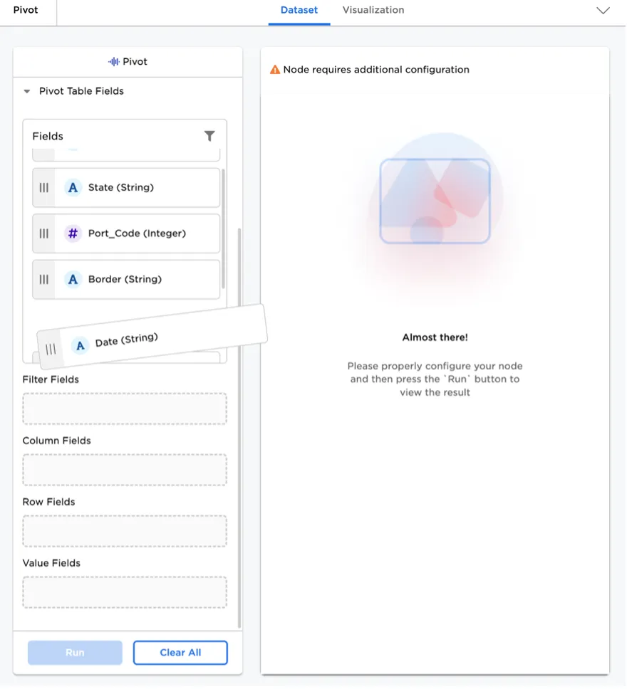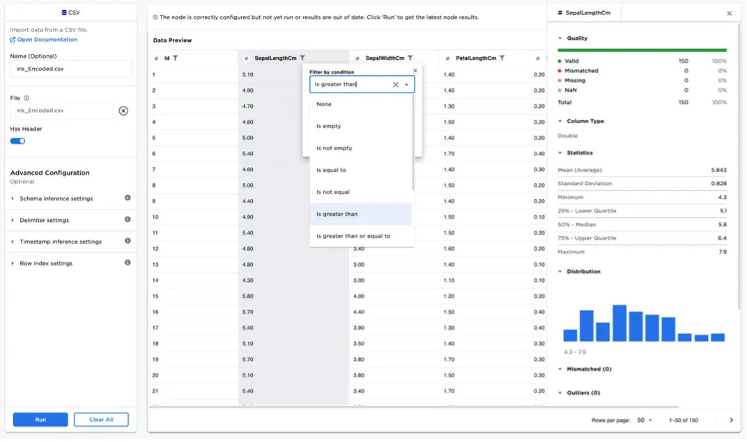 Data at any step in a Visual Notebooks visual notebook can be explored and profiled by simply running the node. Running a node runs the entire visual notebook up to the node undergoing inspection.