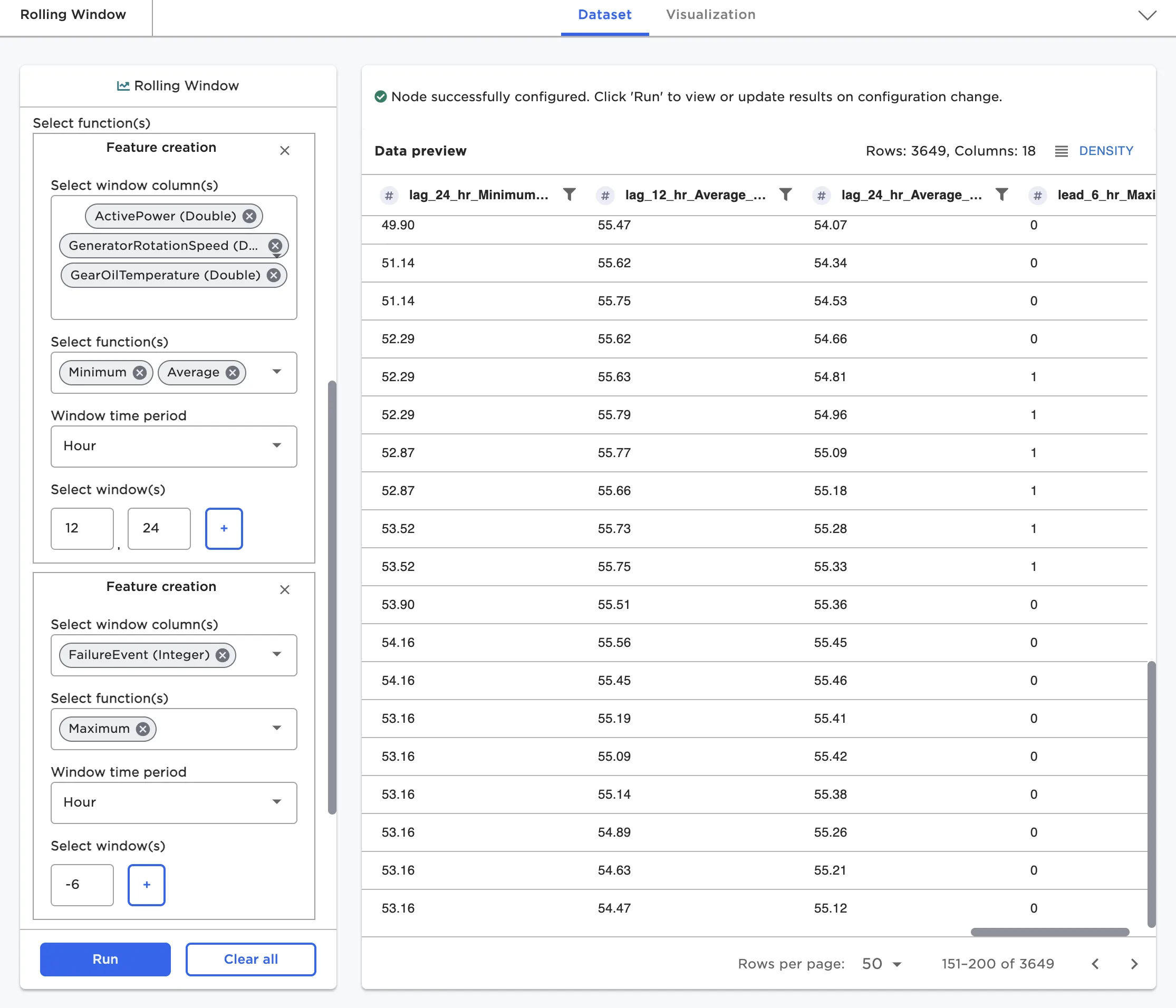The Rolling Window node, as an example, allows the creation of many window features with a single click. Users may simultaneously select multiple columns, multiple functions, and multiple windows. A cross product of the columns, functions, and windows will result in dozens or hundreds of new features. Each feature is added and labeled as a new column with the nomenclature window_function_colname.