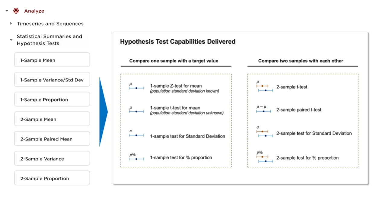 Statistical analysis is an important tool in many data science projects. Visual Notebooks offers several nodes that enable single-sample and multiple-sample hypothesis tests. When combined with statistics charts such as box plots and QQ plots, these nodes enable a wide variety of use cases including: