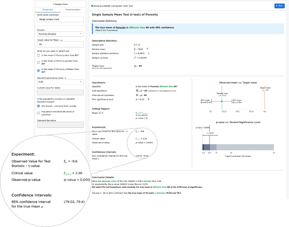 Each statistics node helps with framing a specific test as a hypothesis, with details on test statistic and confidence interval assumptions.