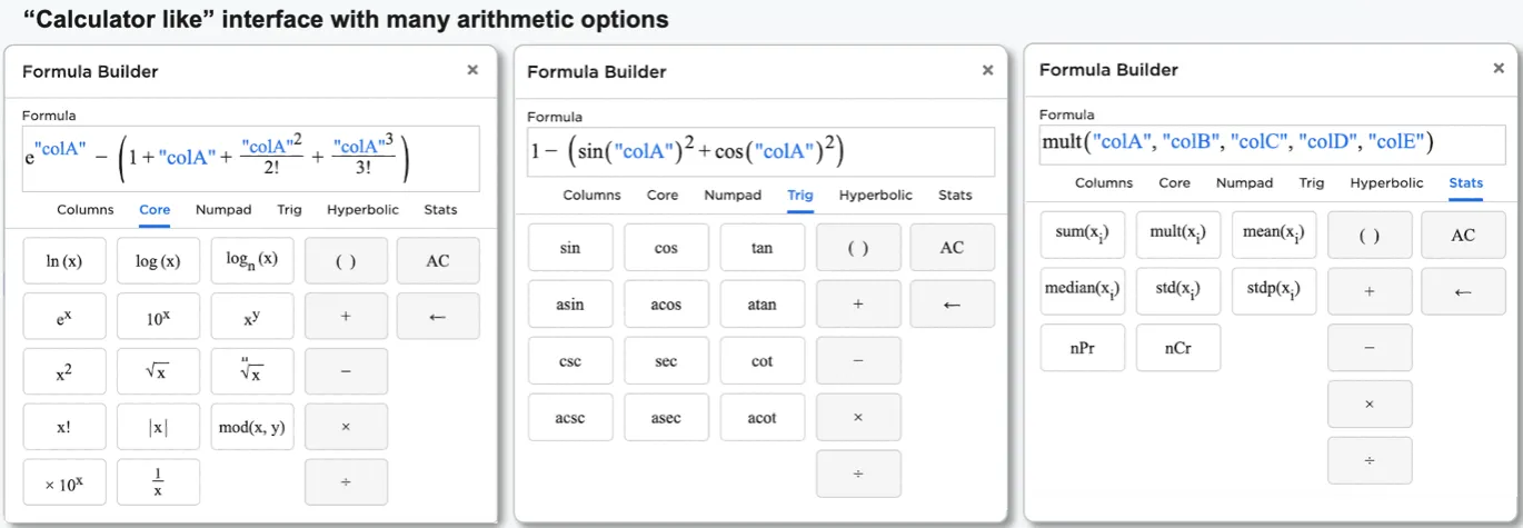The Arithmetic node allows users to perform complex expressions across columns without needing to know any SQL or Python. A calculator-like interface is provided allowing users to select and combine columns and functions.