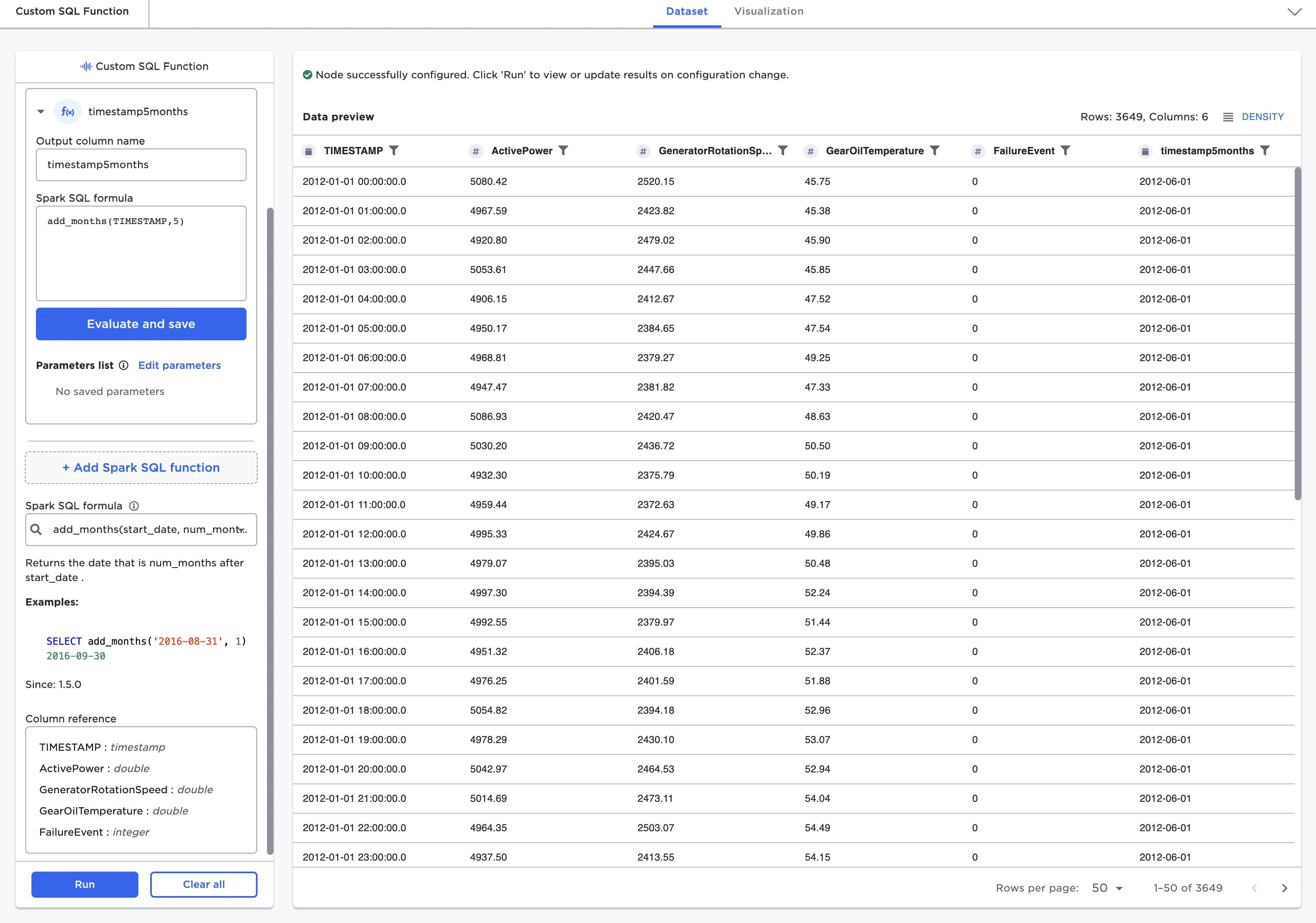The Custom SQL expression node allows users to perform any Spark SQL operation on a dataframe. A list of available columns is provided. The user must "evaluate and save" the SQL expression to ensure it is valid before running the node.