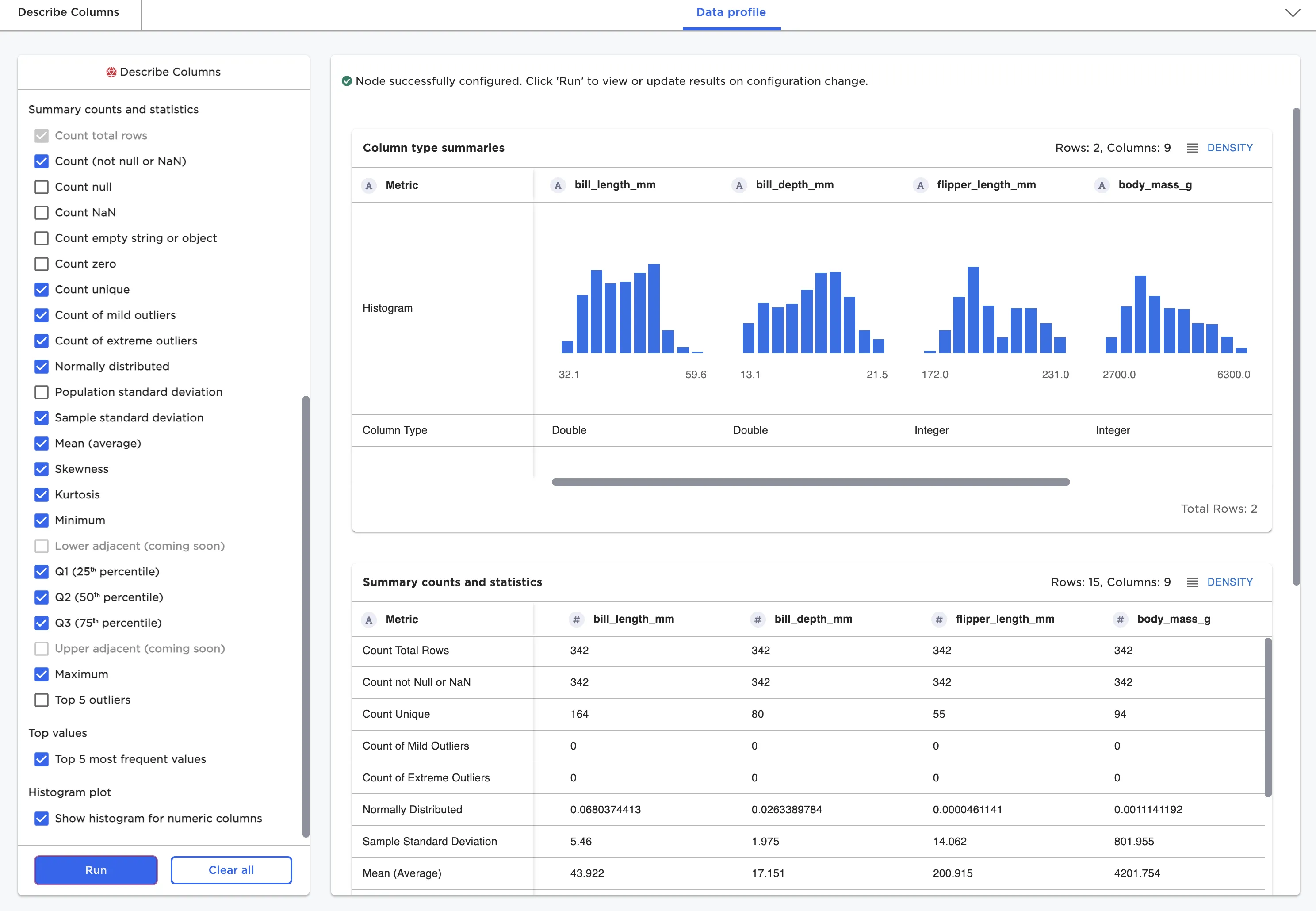 The Describe Columns node is frequently used as a first step in the development of Visual Notebooks visual notebooks and can be used for data quality inspection and general profiling. Capabilities include: