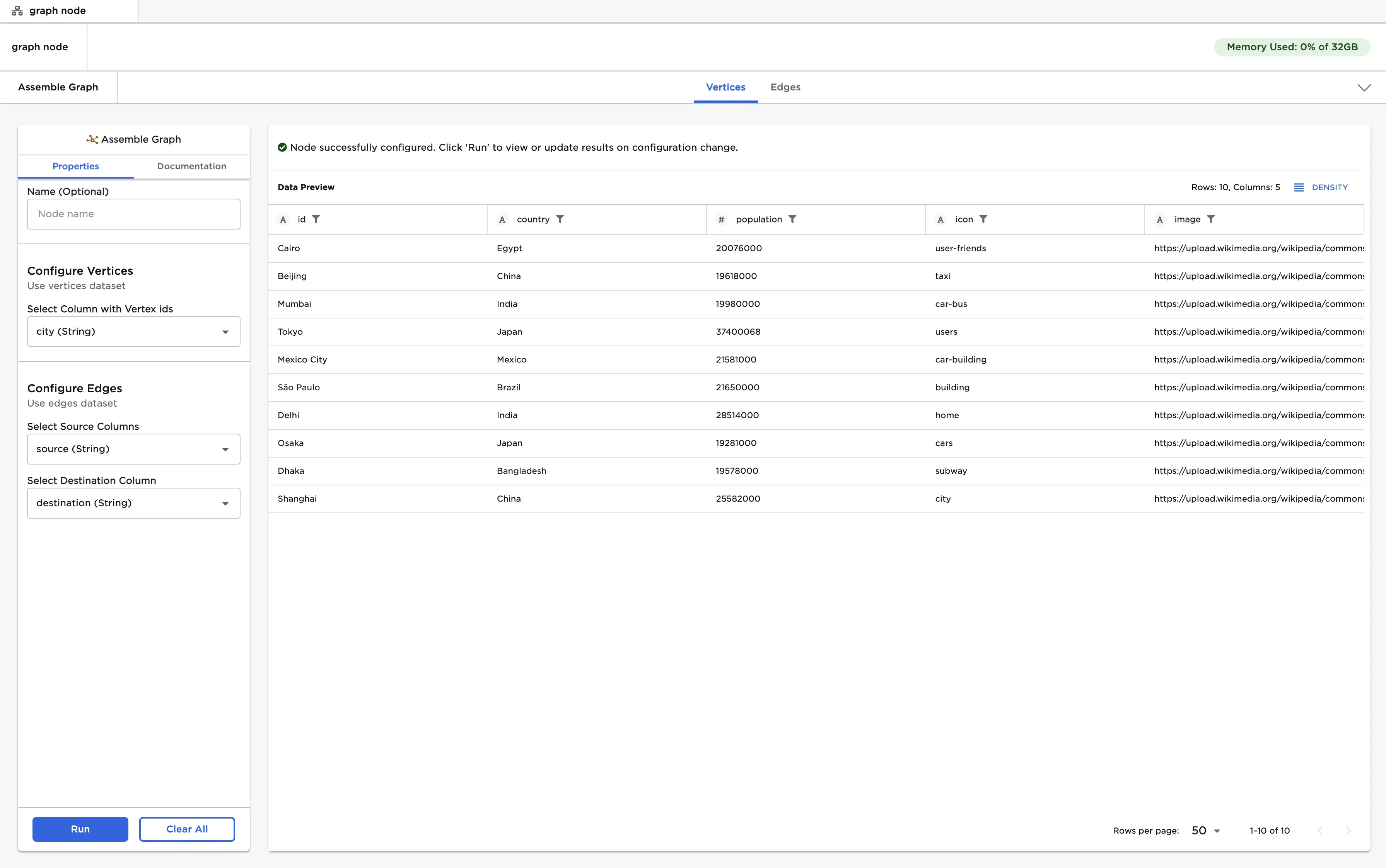 - The vertices data contains a list of cities, countries, population, the name of a supported Font Awesome icon, and a link to an image.