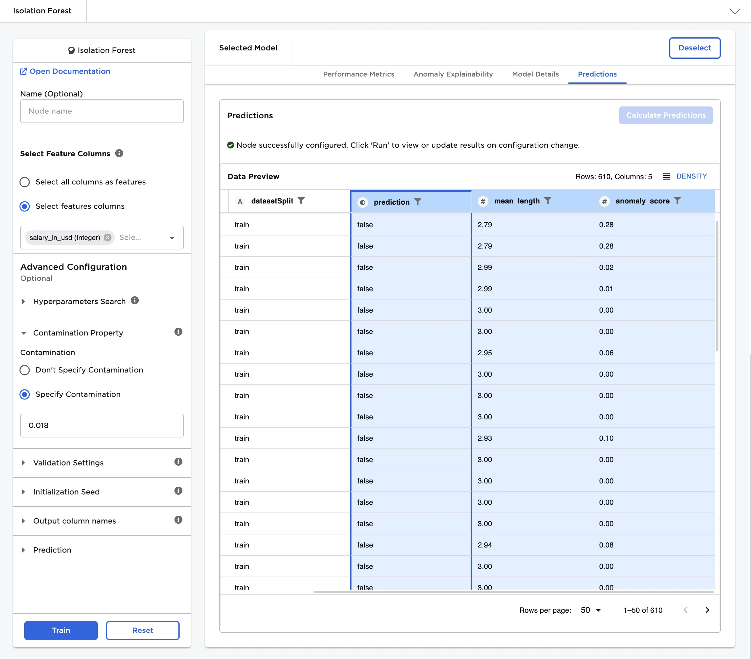 Prediction default=prediction | The column with the model's predictions Enter a name for the column that contains the selected model's predictions. Column names can contain alphanumeric characters and underscores, but cannot contain spaces. This column contains a value of True if the data point is considered an anomaly, and contains a value of False if the data point is normal. If Don't Specify Contamination is selected for the Contamination field, the prediction column will not be visible in the resulting dataframe. |