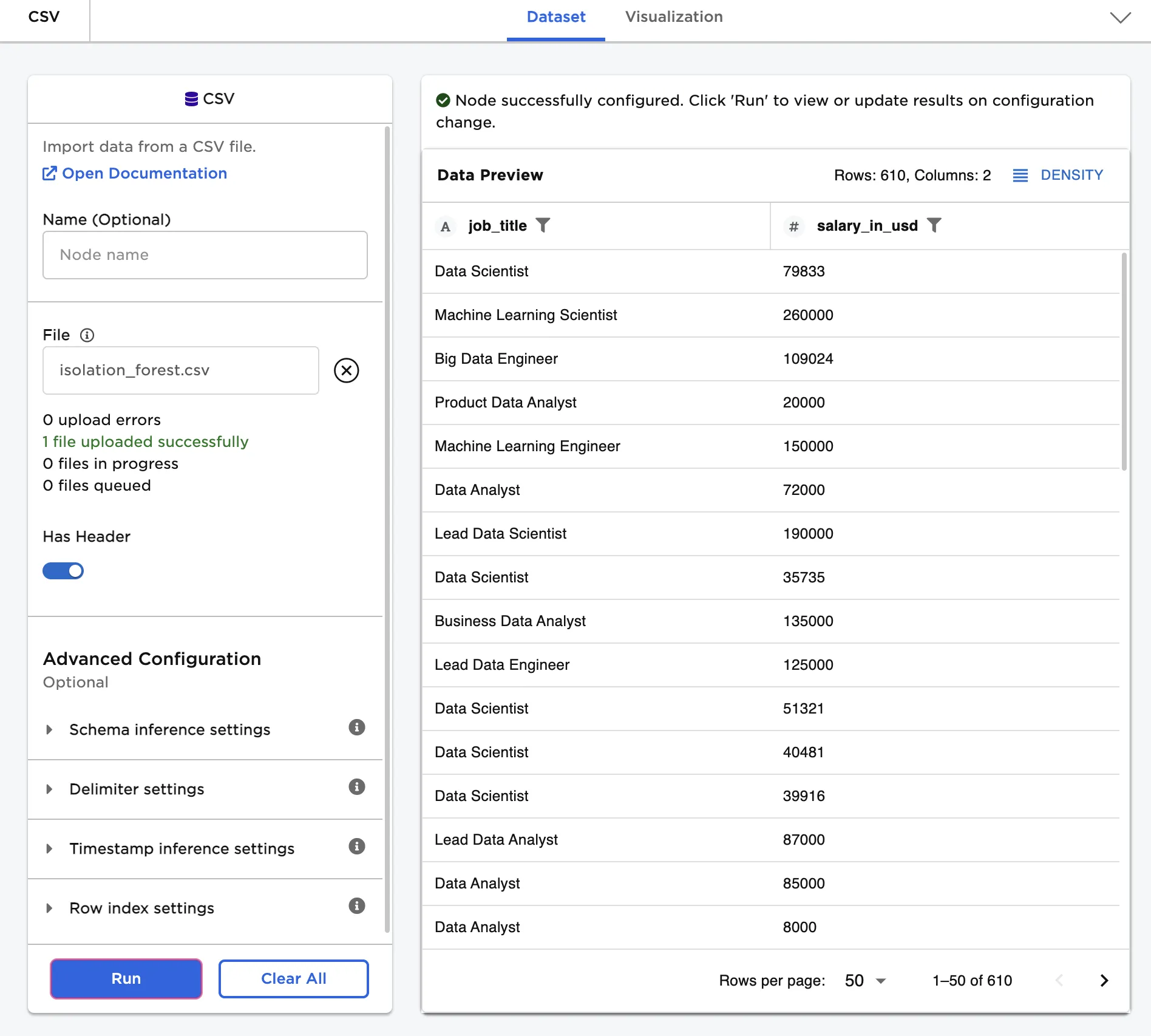 The dataframe shown in Figure 2 contains the job title and yearly salary of more than 600 data science professionals. Use the Isolation Forest node to find any unusually high or unusually low salaries.