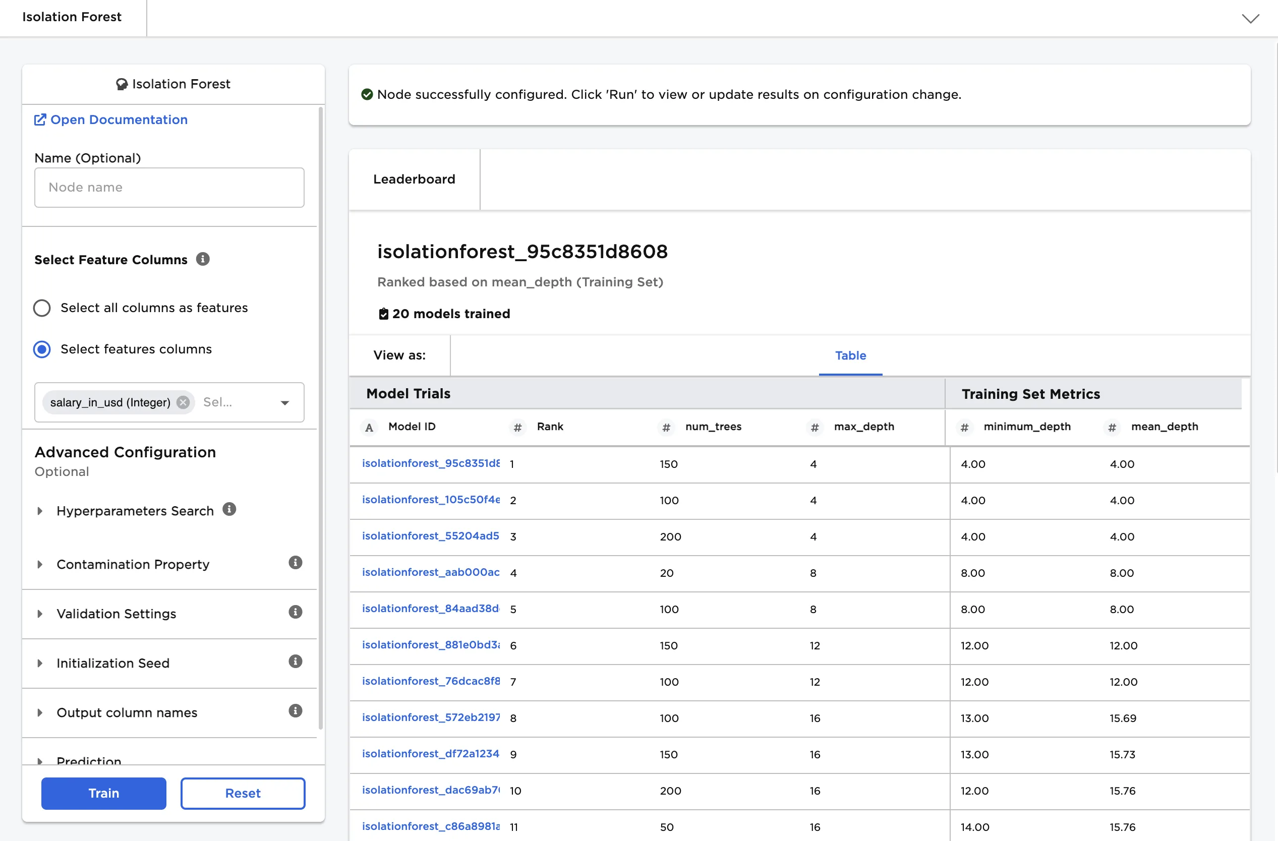 Mean Length default=mean_length | The column with the mean length Enter a name for the column that contains the mean length. Column names can contain alphanumeric characters and underscores, but cannot contain spaces. The mean length is the average number of splits it takes to isolate a data point across all decision trees in the isolation forest. Values with low scores close to 1 are more likely to be anomalous since it takes fewer partitions of the data to isolate them. |