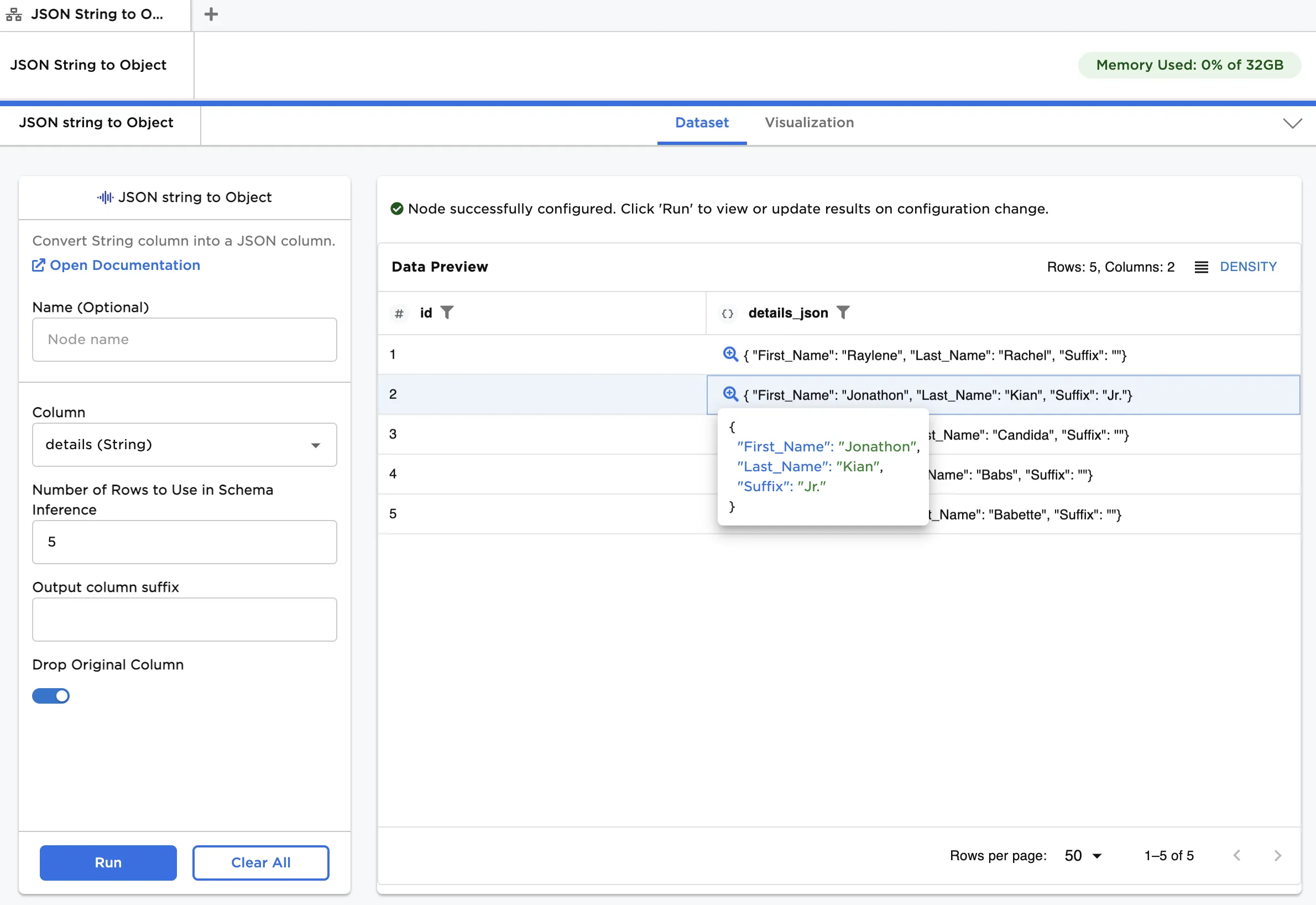 Drop Original Column(s) default=On | Toggle indicating whether the selected input column should be dropped from the output Leave the switch on to delete the input JSON string column from the output dataframe. The column information, however, is preserved in the new Object column. Toggle the switch off to keep the input column. |