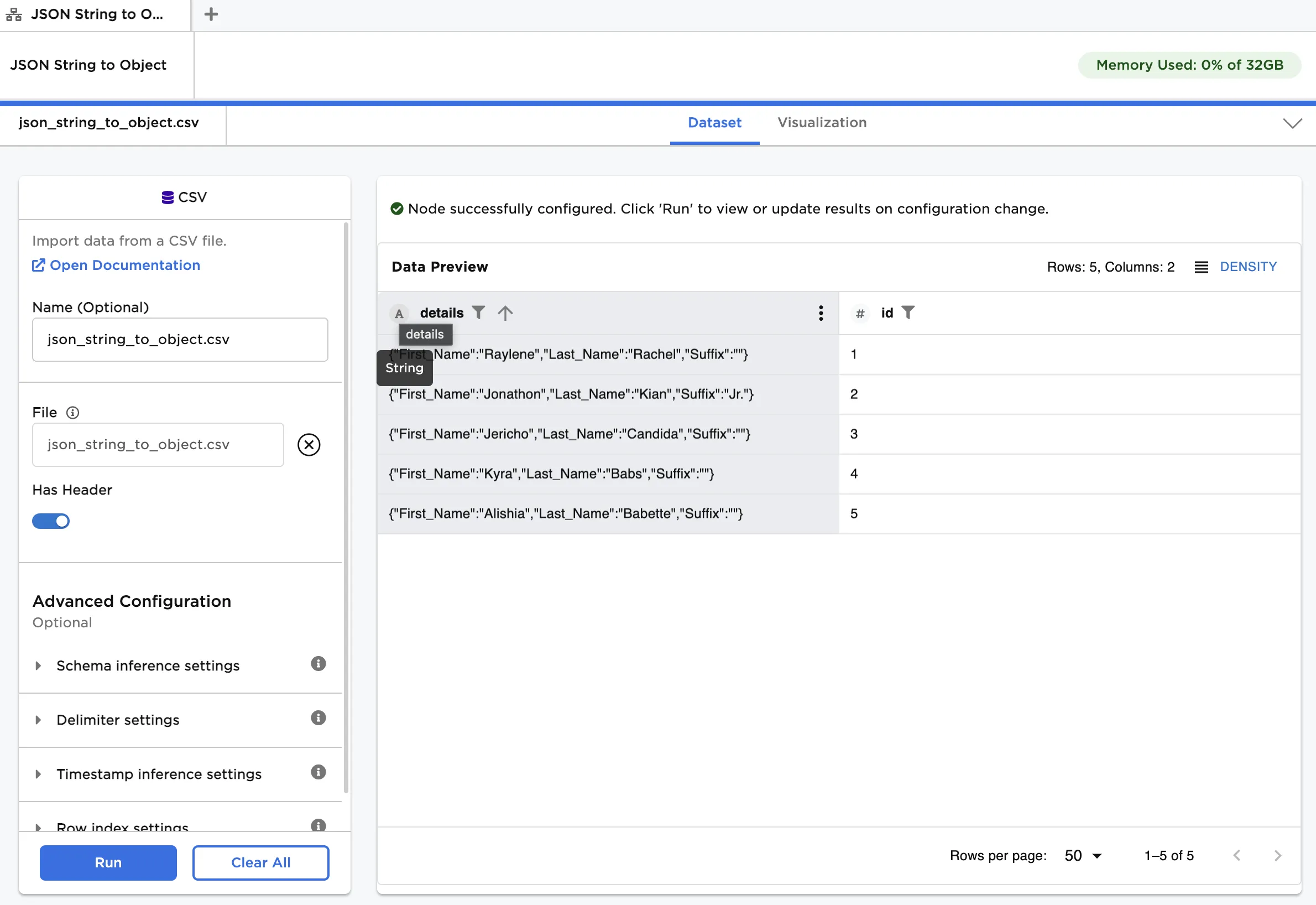 After running the node, the column of customer details changes from a string to an Object data type. This is shown in Figure 3.