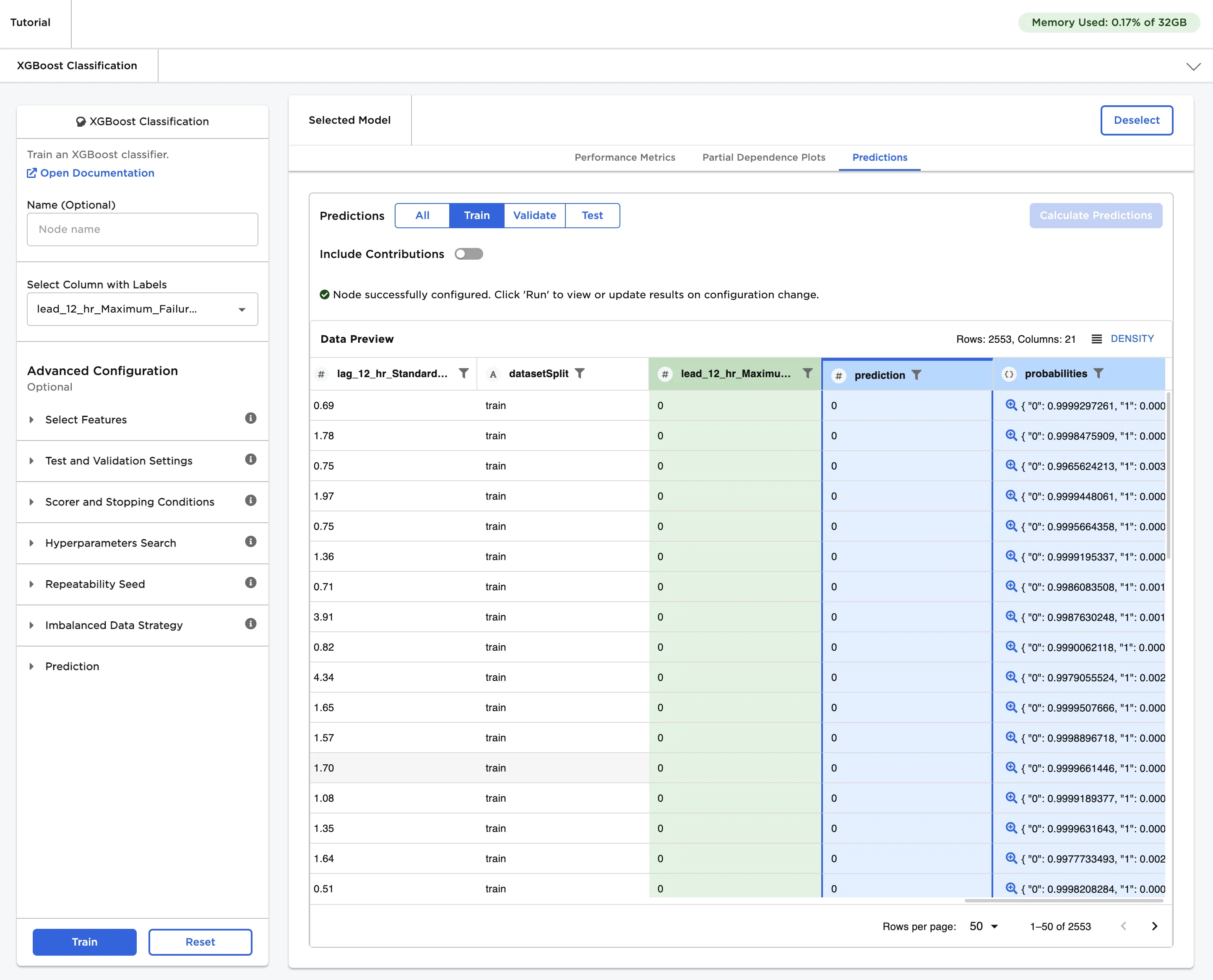 Select the column we made earlier, "lead_12_hr_Maximum_FailureEvent", for the Select column with labels field. This is the value that we want the computer to predict. Once you've filled in that field, click Train.