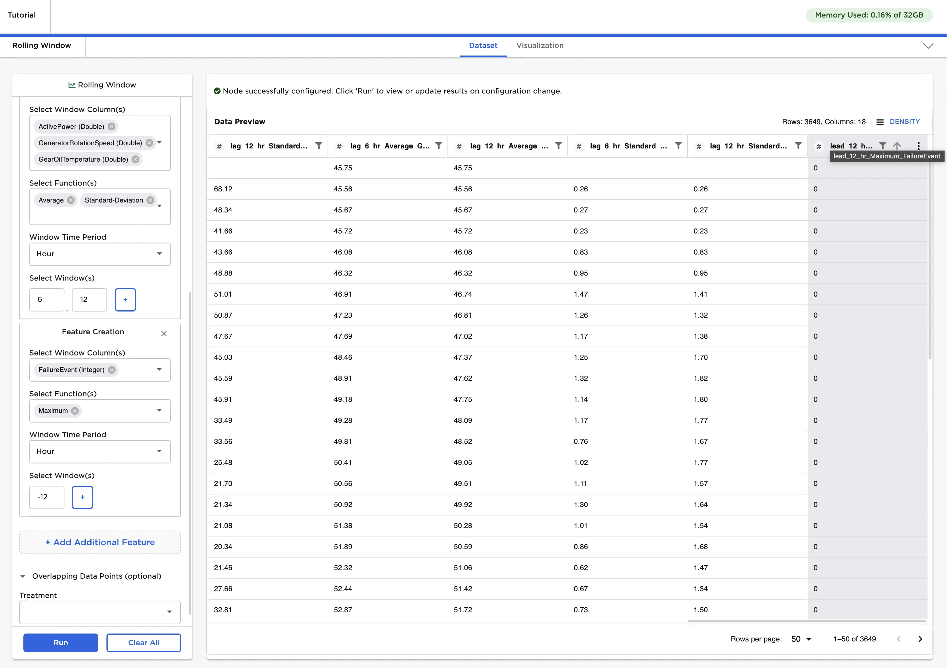 In the last section, we worked on feature engineering with a Rolling Window node. You can also use the Rolling Window node to create the leading indicator--this will become the label we want a machine learning model to predict later in the tutorial.