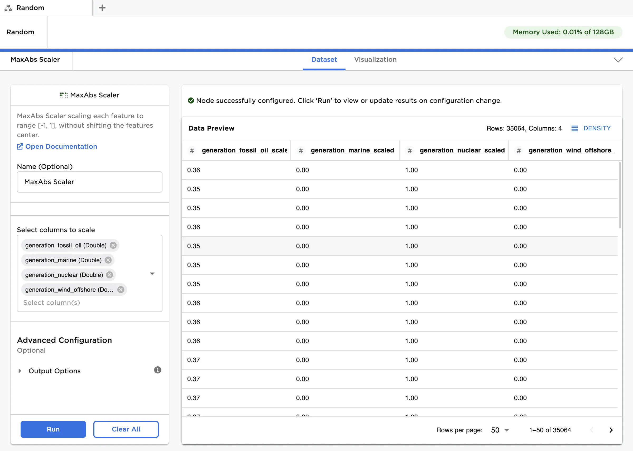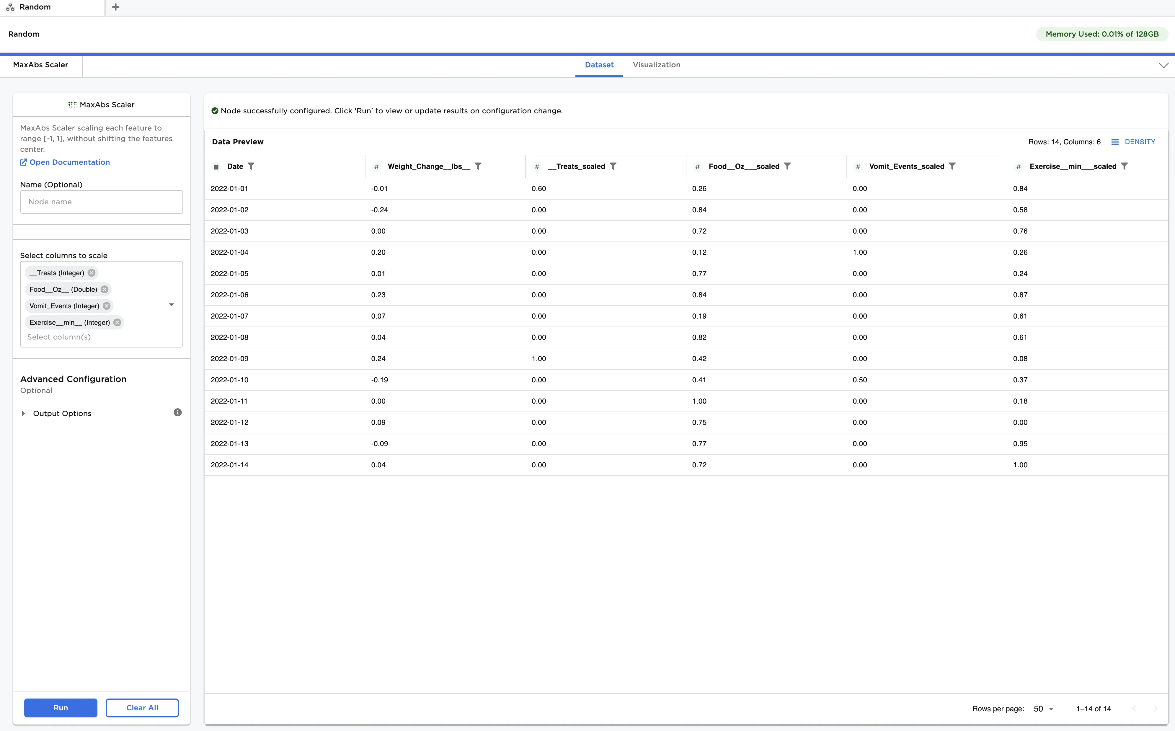 - Click Run to create a dataframe with the default settings. Observe that the original data is replaced with the scaled data. Each entry has been modified according to the following formula: