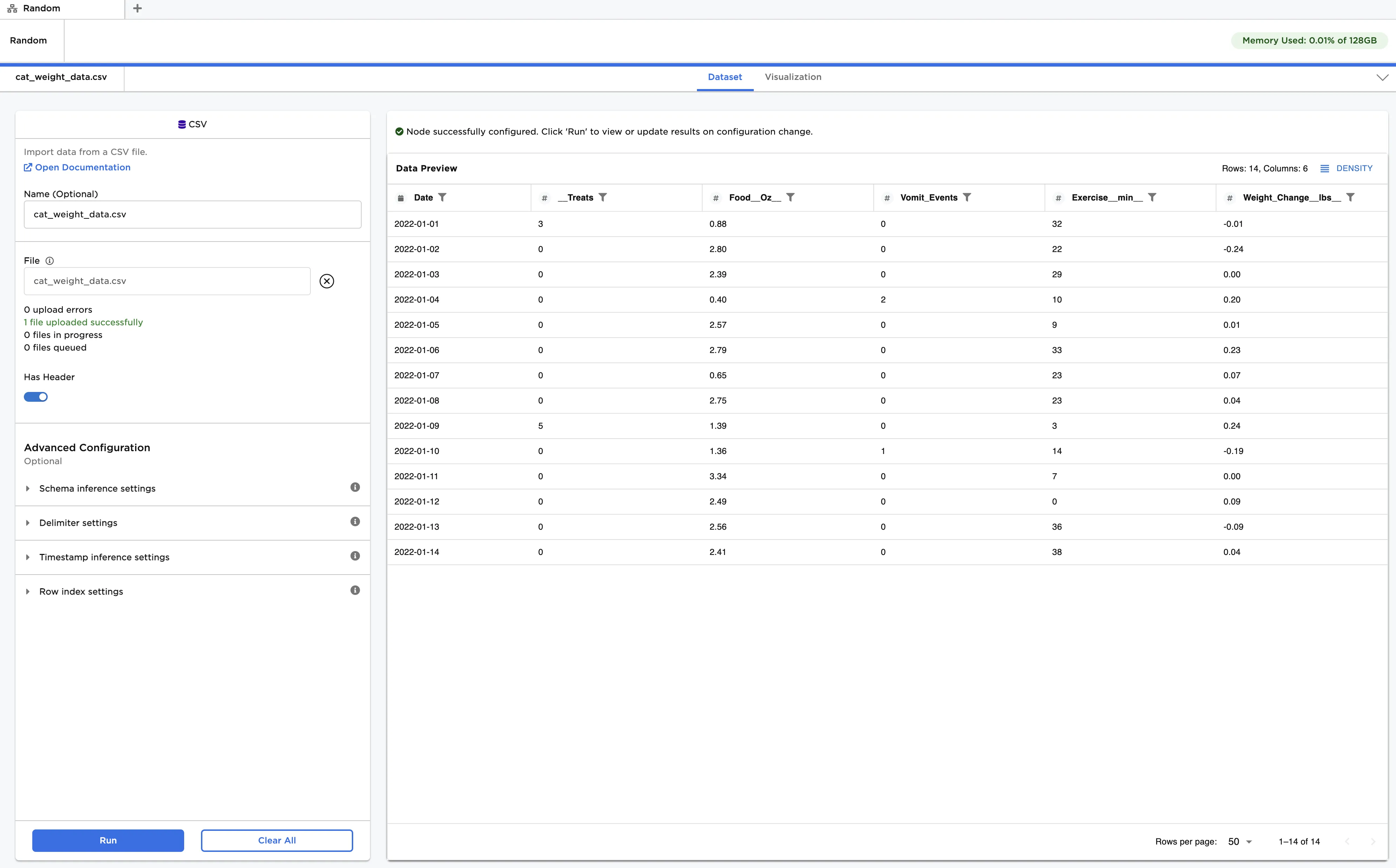 The data shown in Figure 2 is used in this example. It contains daily diet and behavior data for a pet cat, along with its change in weight. We would like to train a multivariate timeseries forecasting model to predict changes in weight several days into the future. Given that the _Treats and Vomit_Events columns have sparse data, we will first normalize all data using the MaxAbs Scaler node.