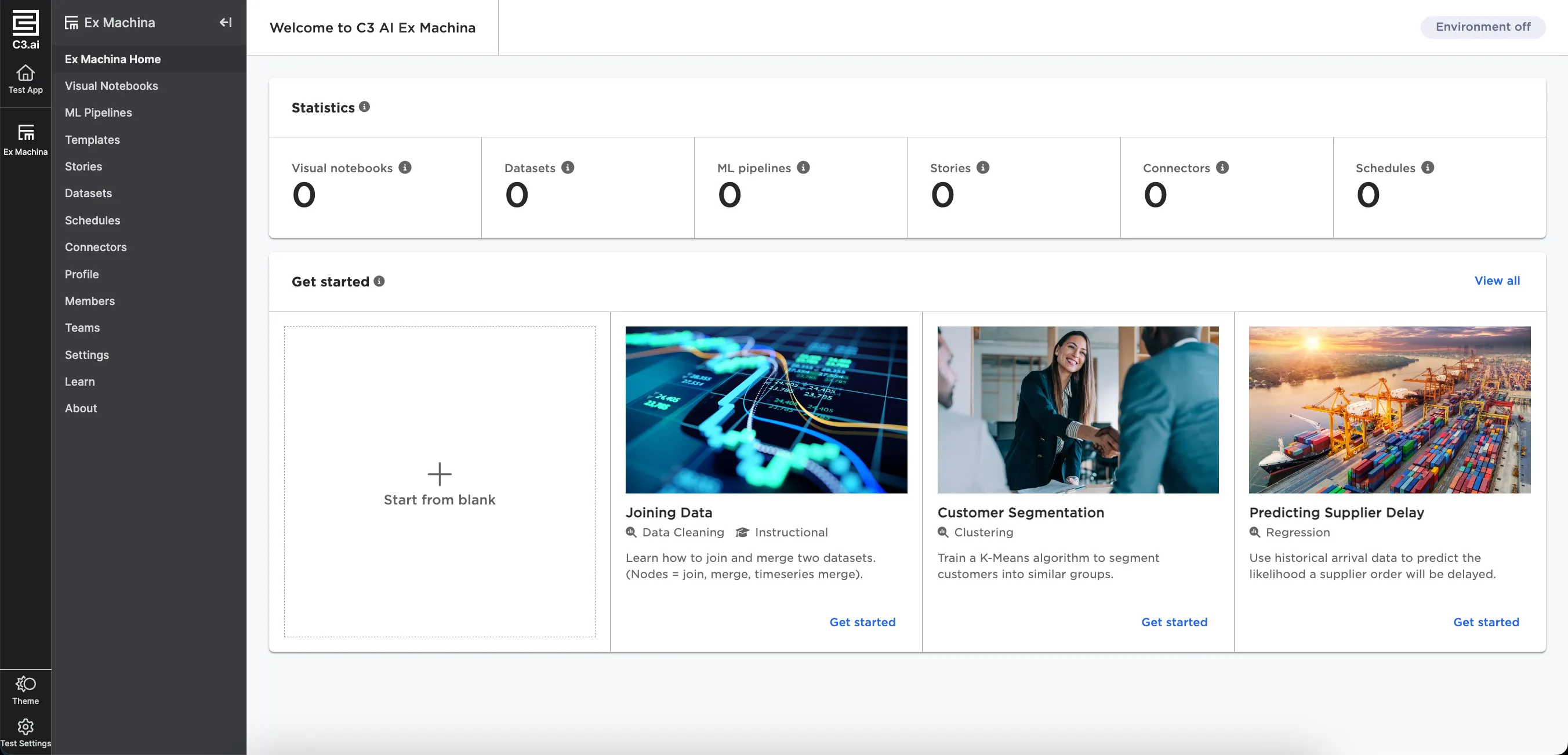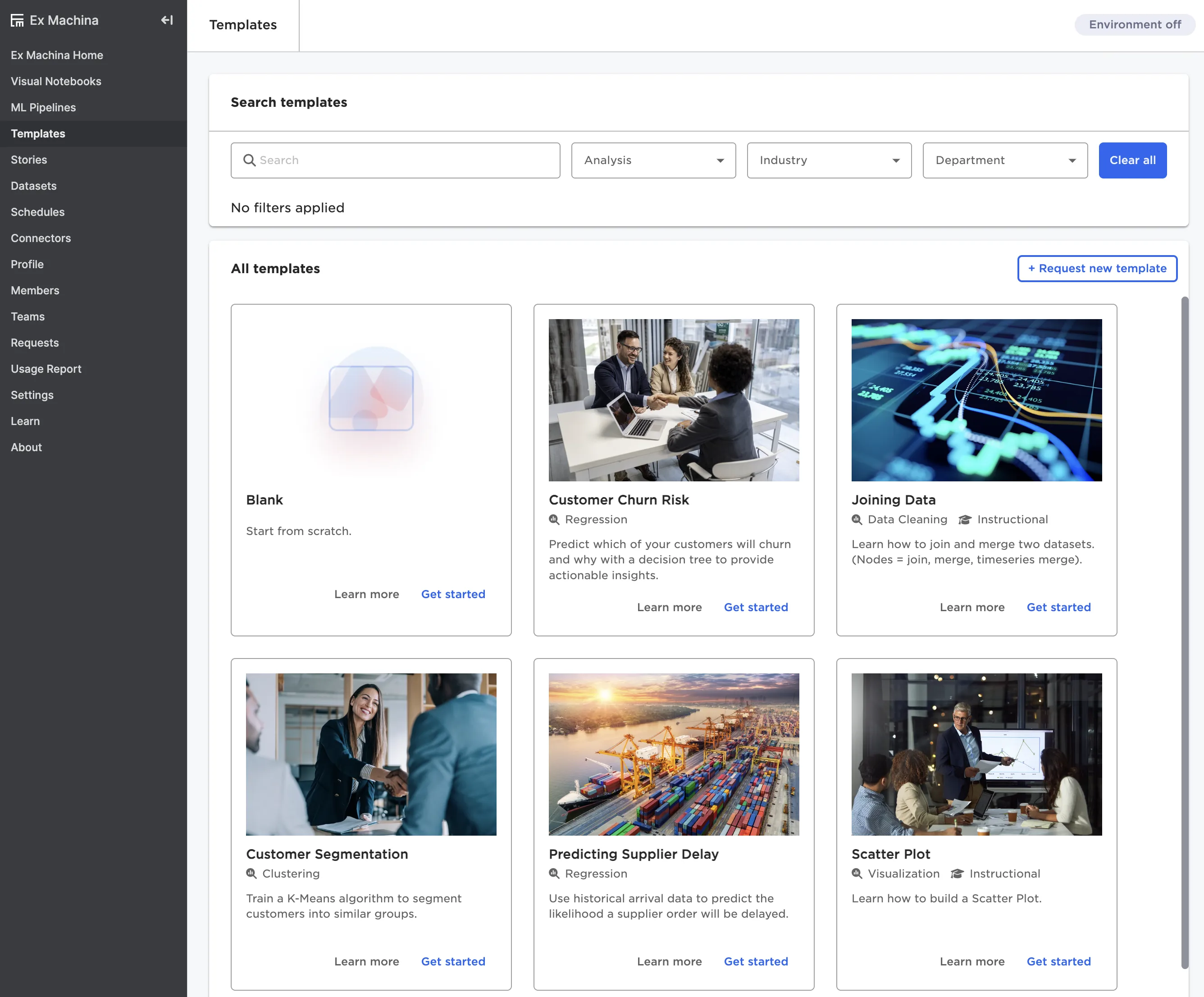 This page shows all available templates in your instance of Visual Notebooks. Templates are customizable, pre-configured visual notebooks meant to serve as a starting point when solving a specific use case.