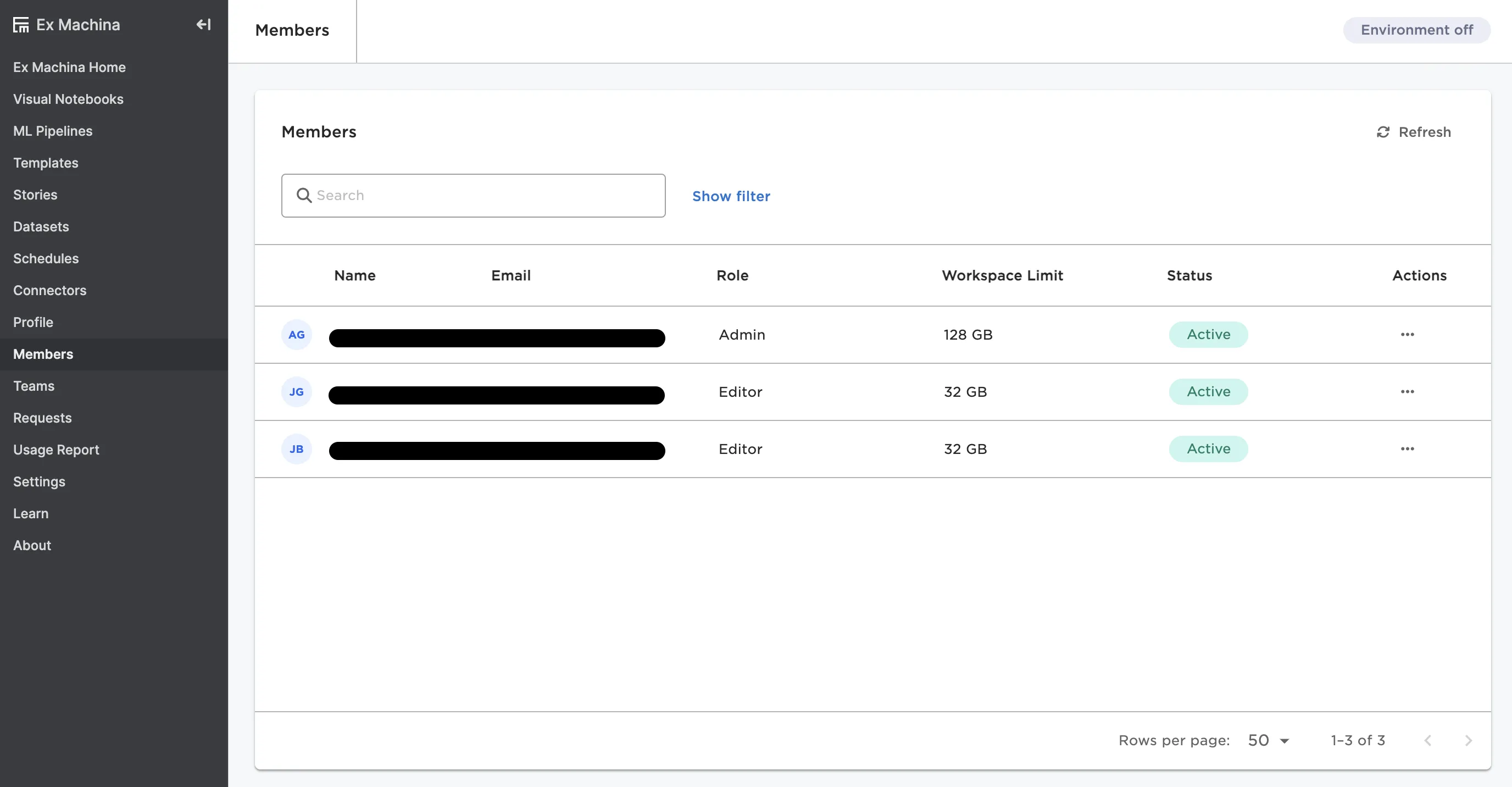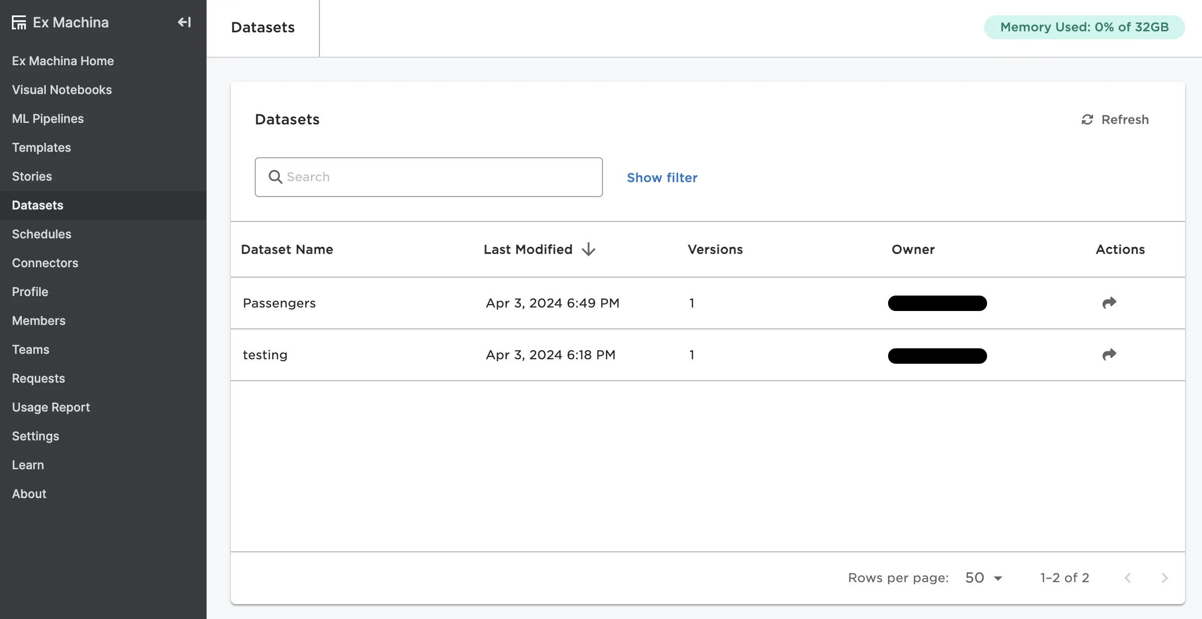 This page shows a list of all datasets you have access to. For more information on datasets, see the Datasets section.