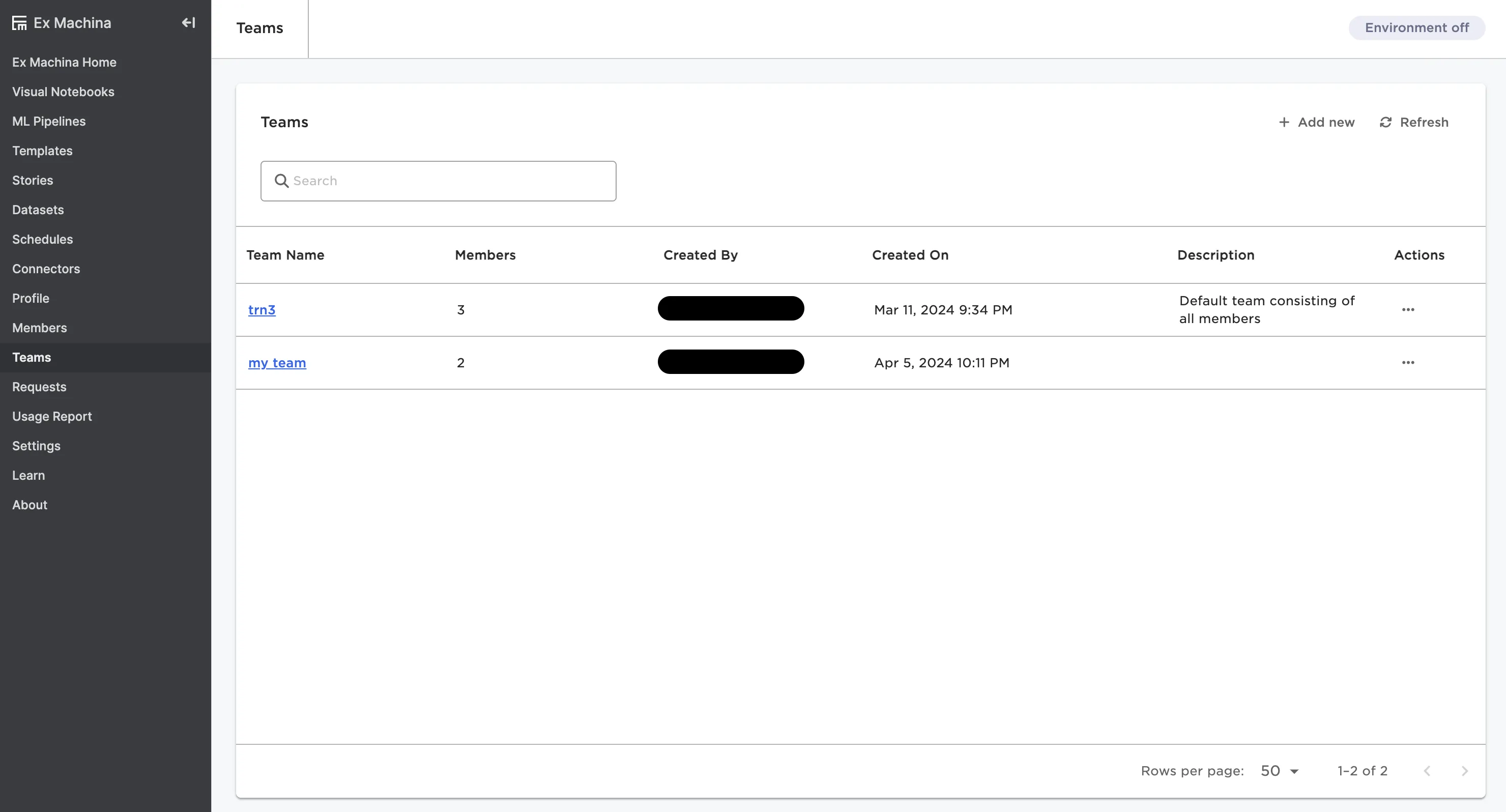This page shows teams within Visual Notebooks. Select a team to see existing members and add new members. Create new teams by selecting the + Add new button in the top right corner. For more information on creating and managing teams, see the Collaboration section.