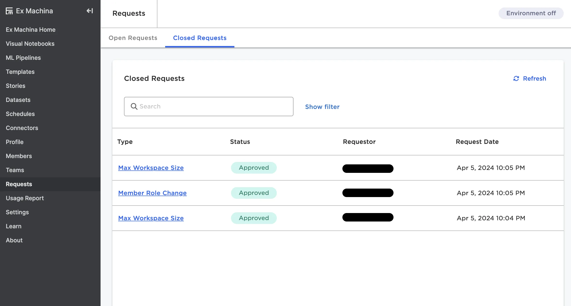 This page displays all user changes within Visual Notebooks. When an admin changes a user's max workspace size or adjusts their role, the actions shows up as a request. View either open or closed requests.
