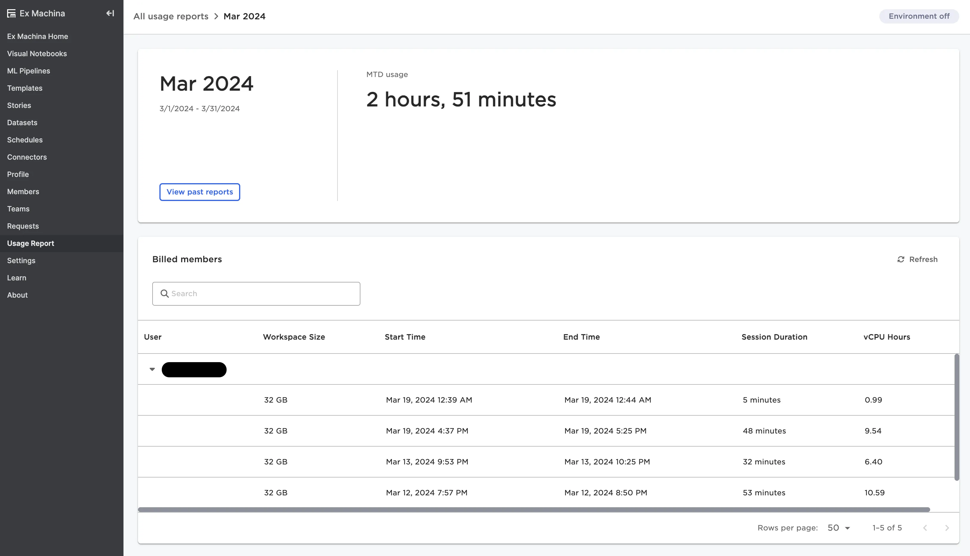 This page provides product usage information on a monthly basis. Select a month to view the usage for that month broken down by each user's individual sessions.