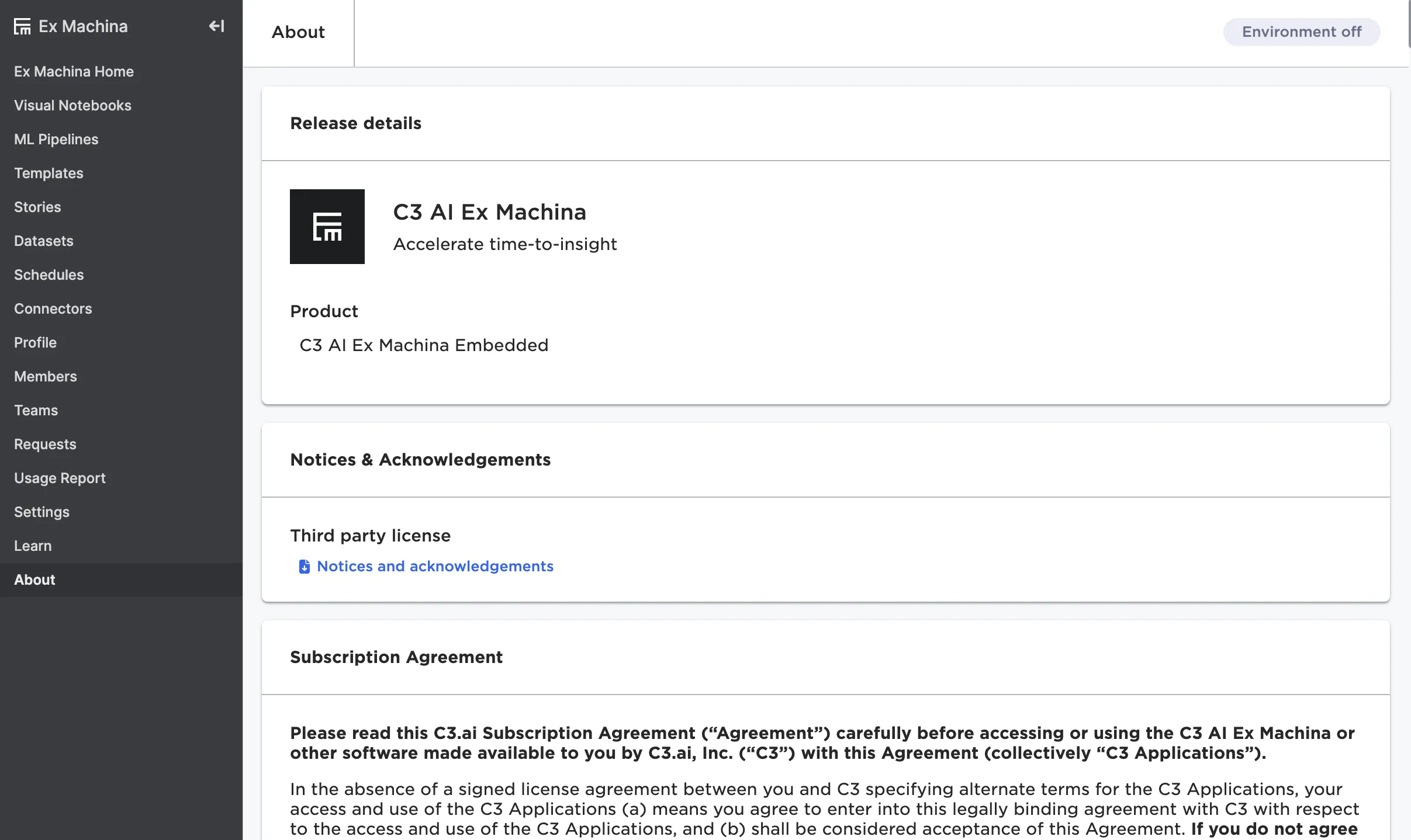 This page provides important legal information, including third part notices and licenses, the C3 AI subscription agreement, and product version details.