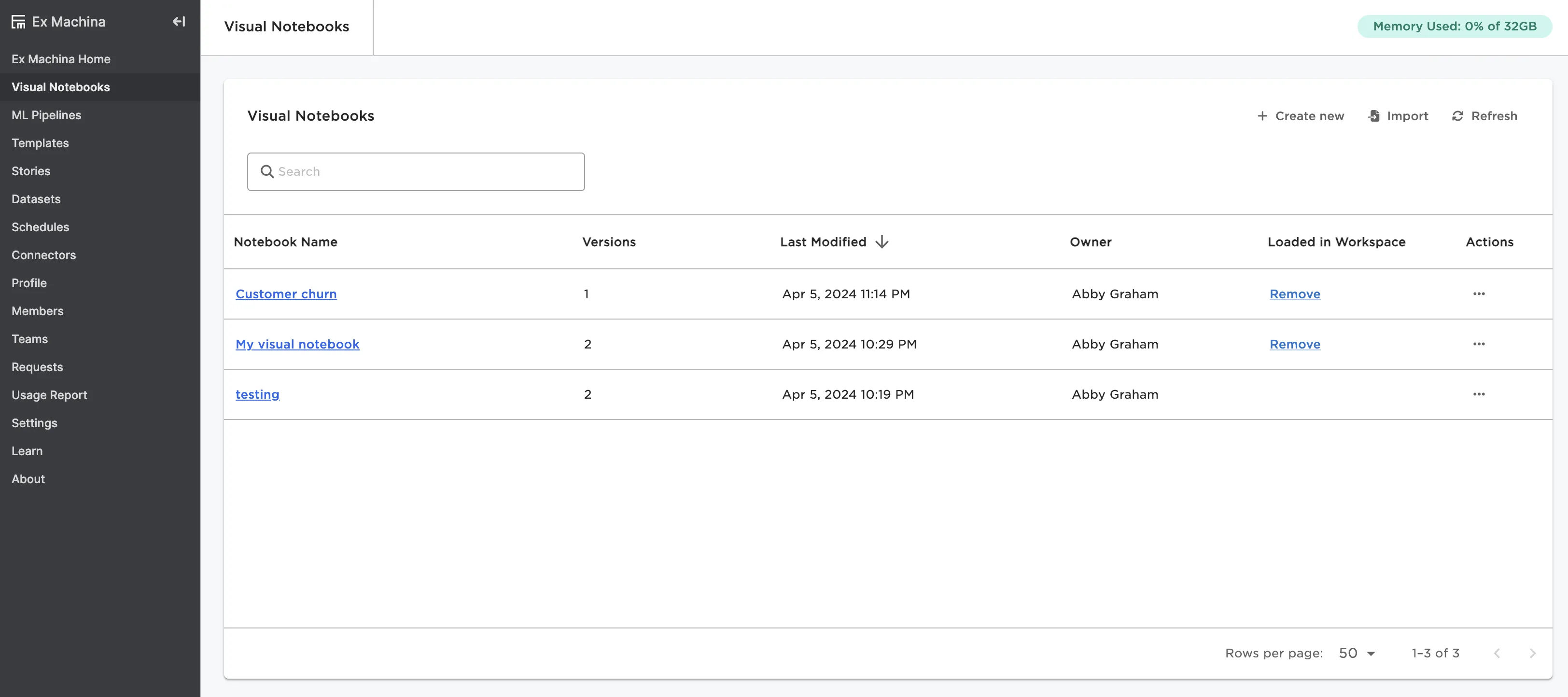 This page shows all visual notebooks that you've created. Create a new visual notebook or open an existing one. For more information on visual notebooks, see the Visual Notebooks section.