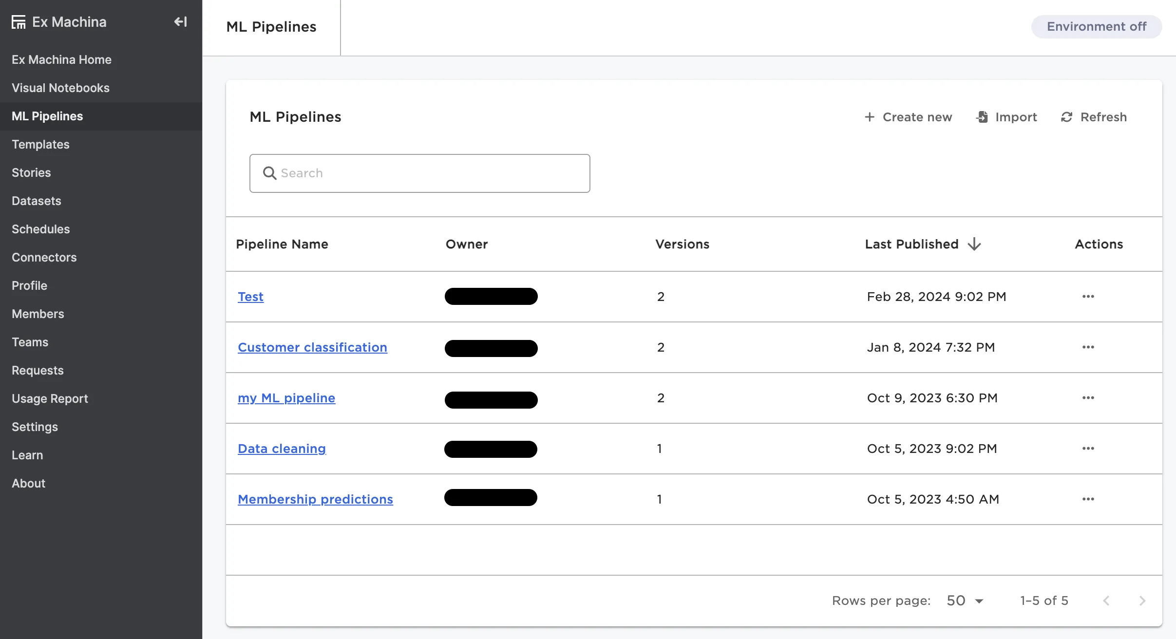 This page shows all ML pipelines that you've created. Create a new ML pipeline or open an existing pipeline. For more information on ML pipelines, see the ML Pipelines section.