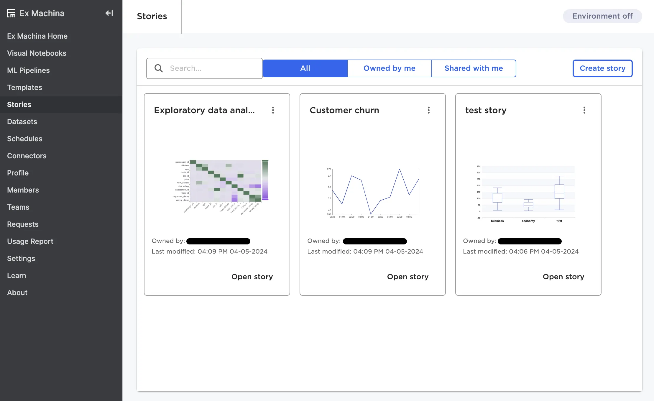 This page shows all stories that you have created or have access to. Create a new story or view an existing story. For more information on stories, see the Stories section.