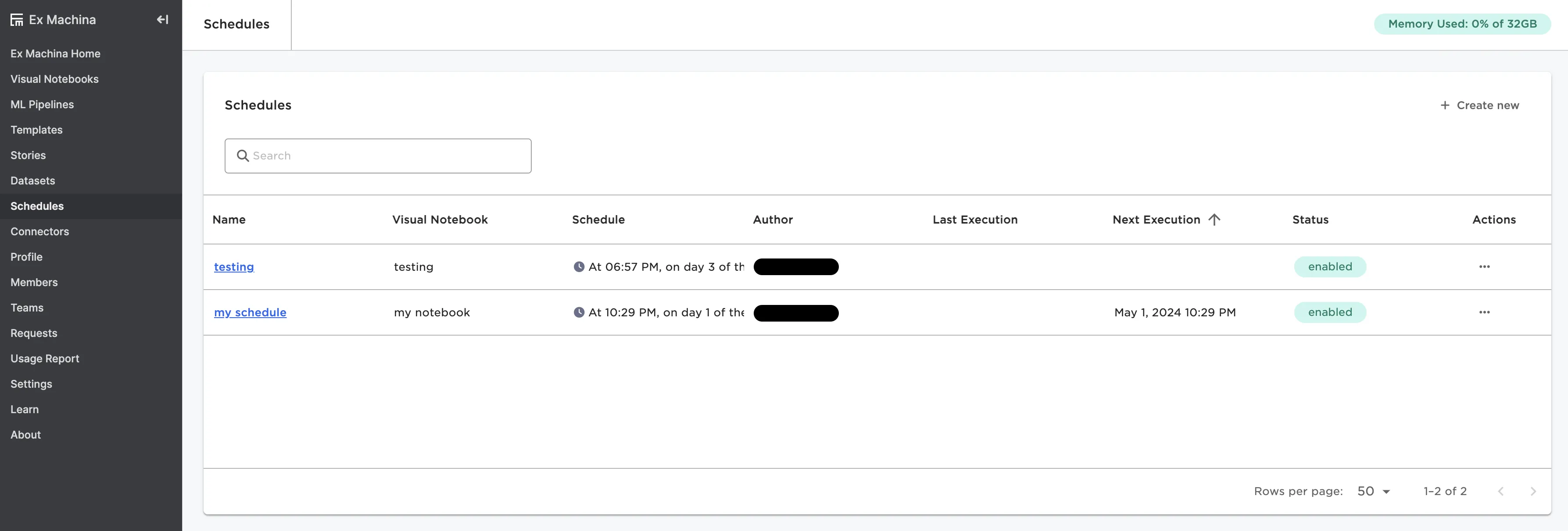 This page shows a list of all schedules you've created. Create a new schedule or view historical executions of existing schedules. For more information on schedules, see the Schedules section.