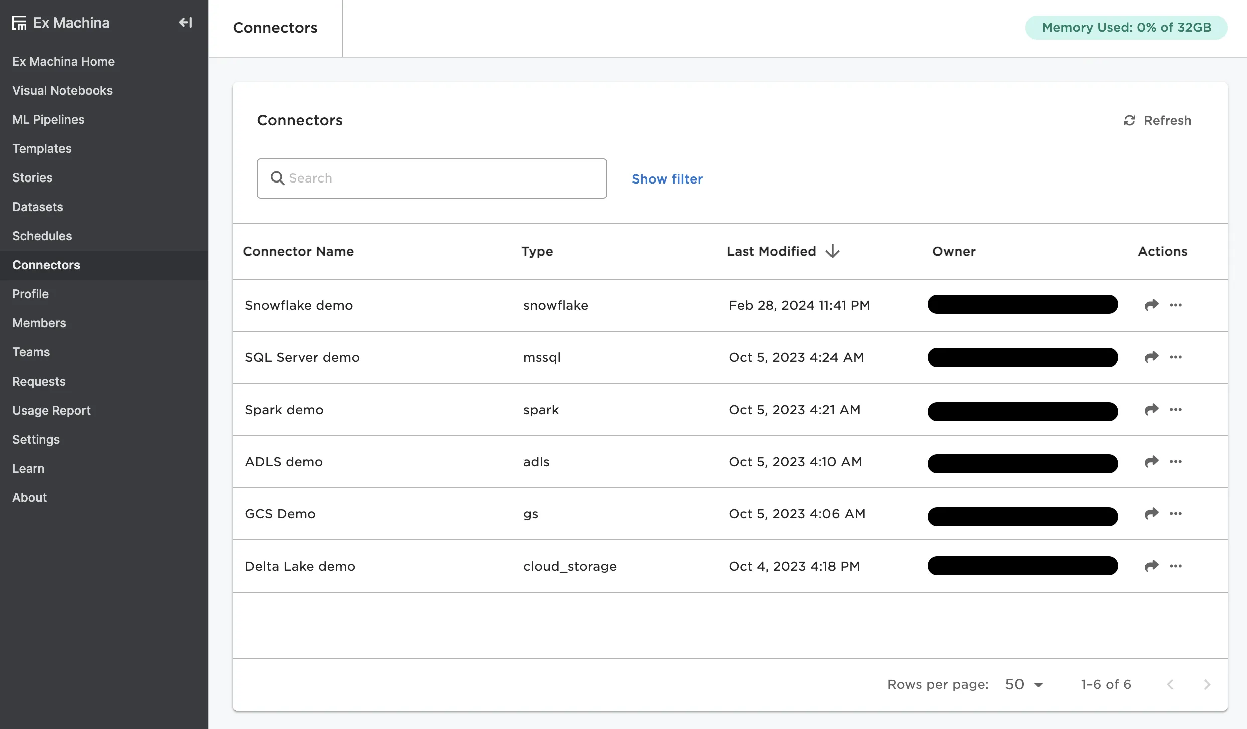 This page shows a list of all connectors configured in Visual Notebooks that you have access to. Select the arrow icon under the Actions column to share a specific connector with a team of users. For more information on connectors, see the sections on Input Connectors and Output Connectors.