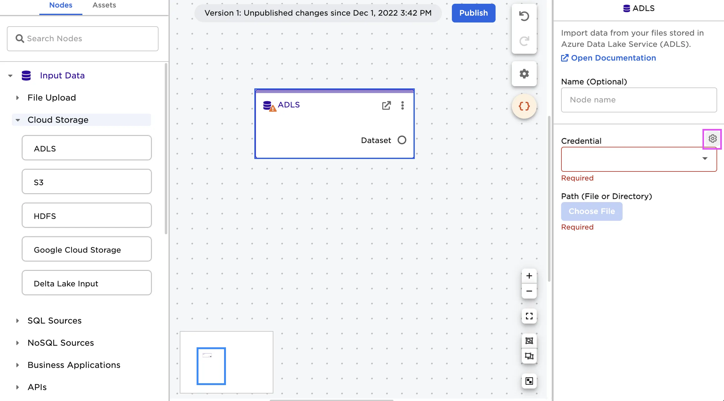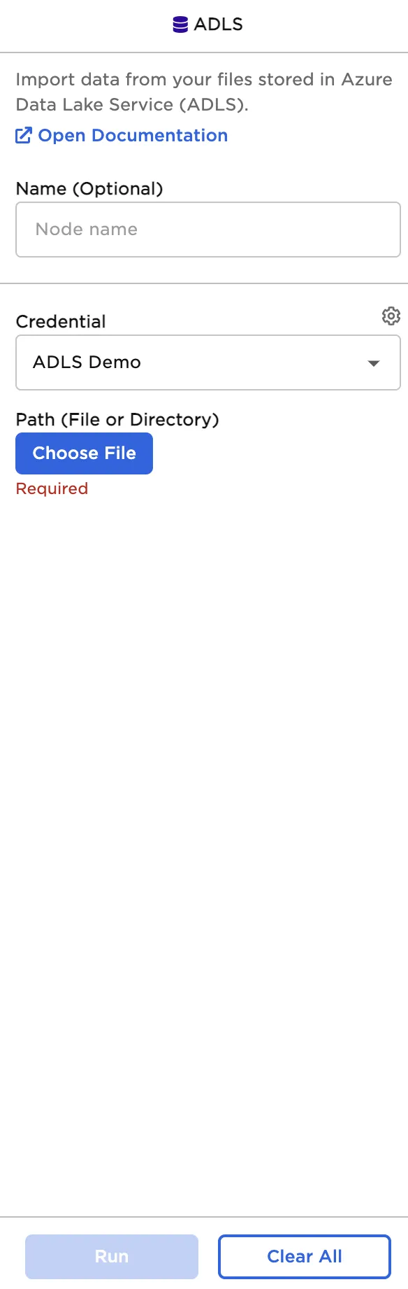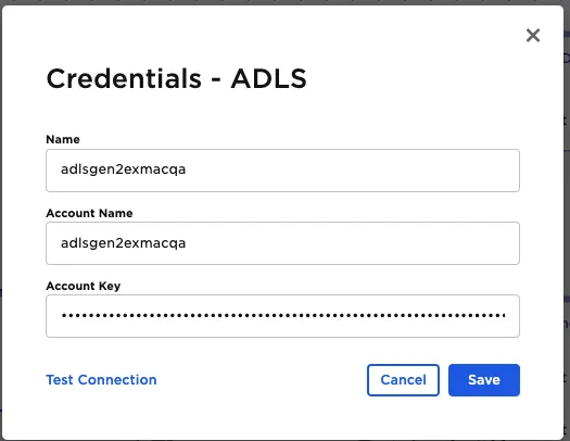 | Credential Required | The information needed to access ADLS data Select a saved credential from the dropdown menu. Select the gear icon to add a new credential or delete existing credentials. |