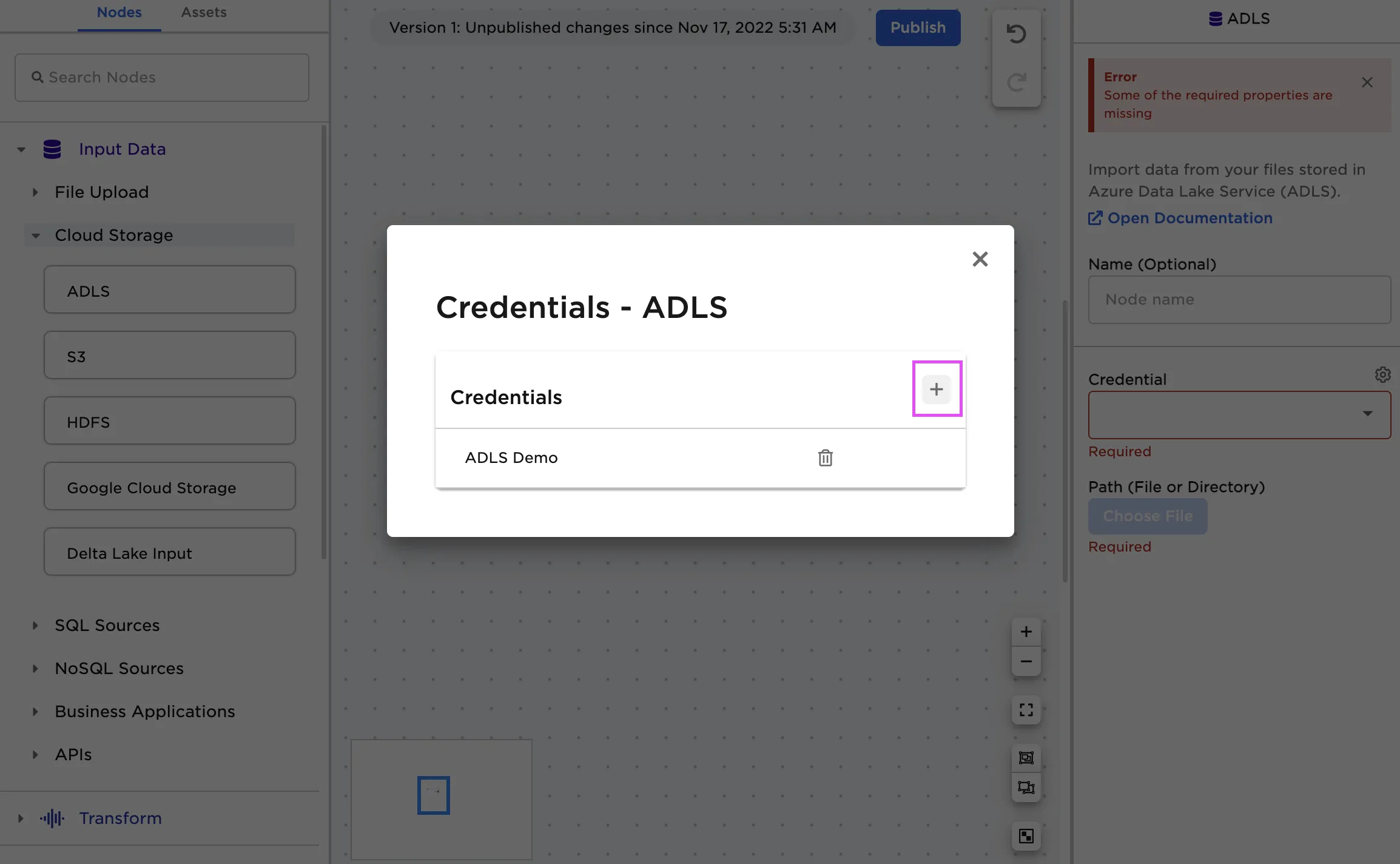 - In Visual Notebooks, drag an ADLS node onto the canvas