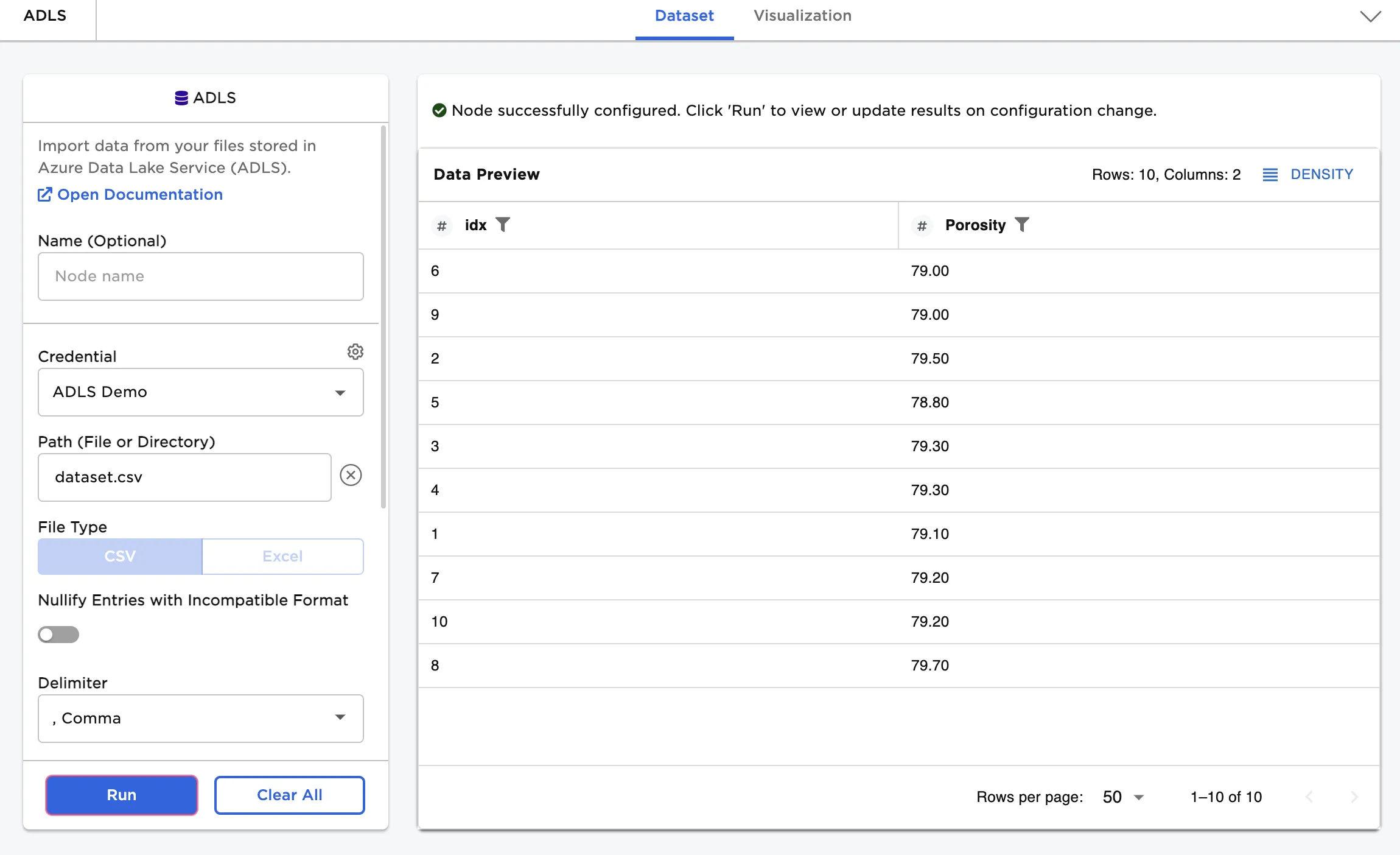 Input data from Azure Data Lake Storage (ADLS) to Visual Notebooks. You must have an existing ADLS account to use this node. For more information about ADLS, see Azure Data Lake Storage.