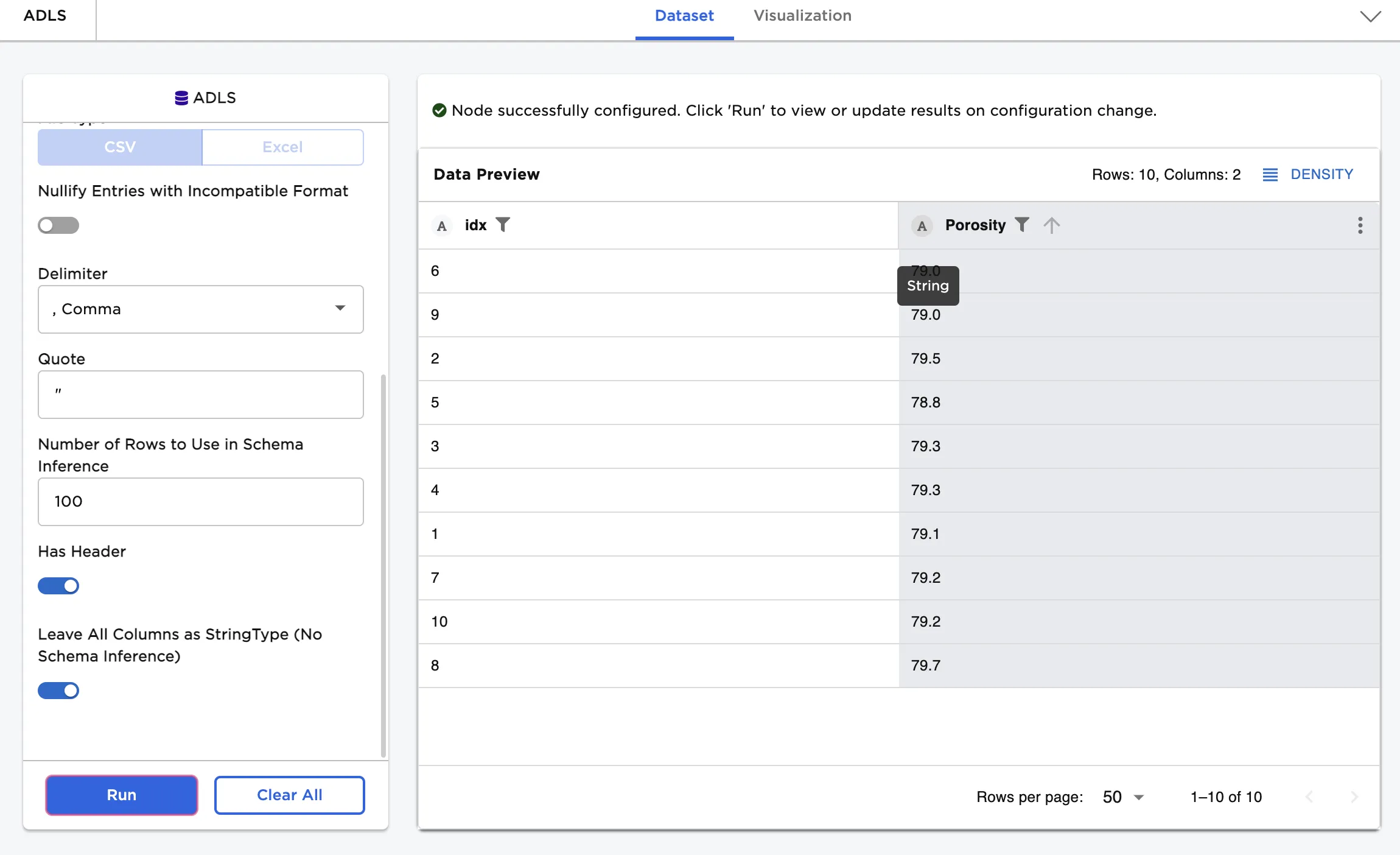 If you want to upload all data as strings, toggle the Leave all columns as StringType (no schema inference) switch on and select Run. Notice that the "A" symbol beside each column indicates the string data type.